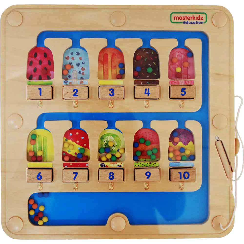 A popsicle-themed 1-10 learning magnetic maze all children will love. Adults can place the 10 wooden tiles randomly which will determine the number of beads should be placed in the corresponding popsicle. Wooden tiles are printed with arabic numbers and corresponding number of dots on 2 opposite sides. A great interactive number learning toy.