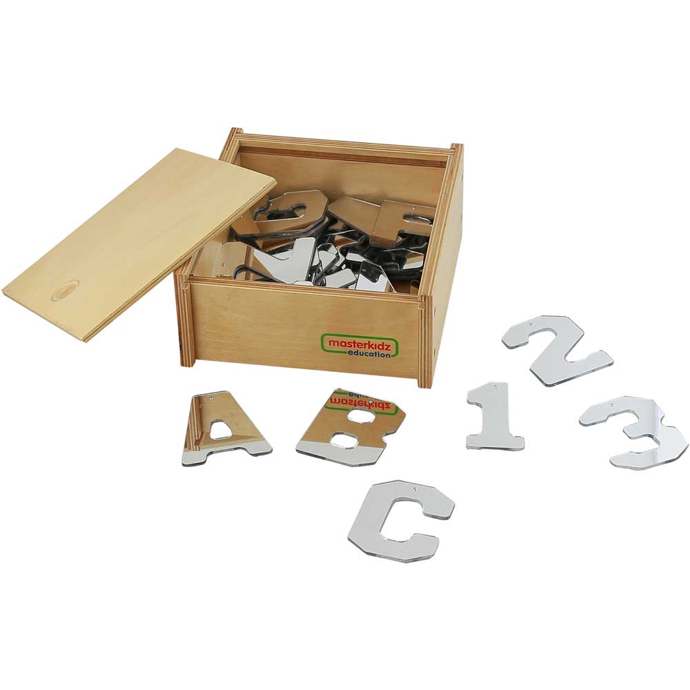 A set of 36 Piece 2-sided scratch resistent alphabet and numbers encouraging learning of alphabet and numbers through holding and feeling the pieces with visual stimulations from the reflections. Each piece is up to 4mm thick and 80mm high. Both sides of the mirror are scratch resistent making it a durable learning toy.