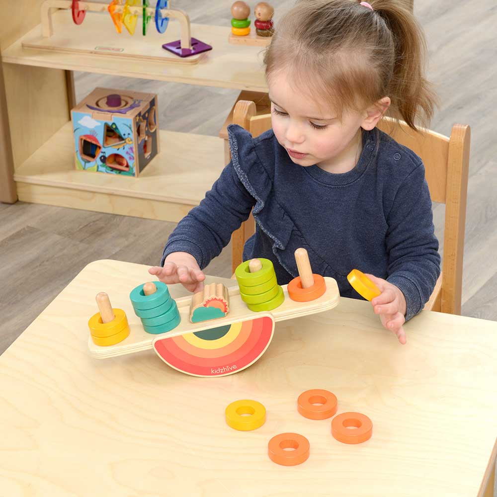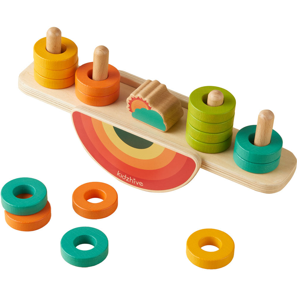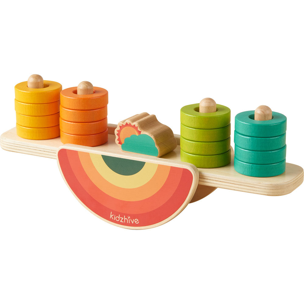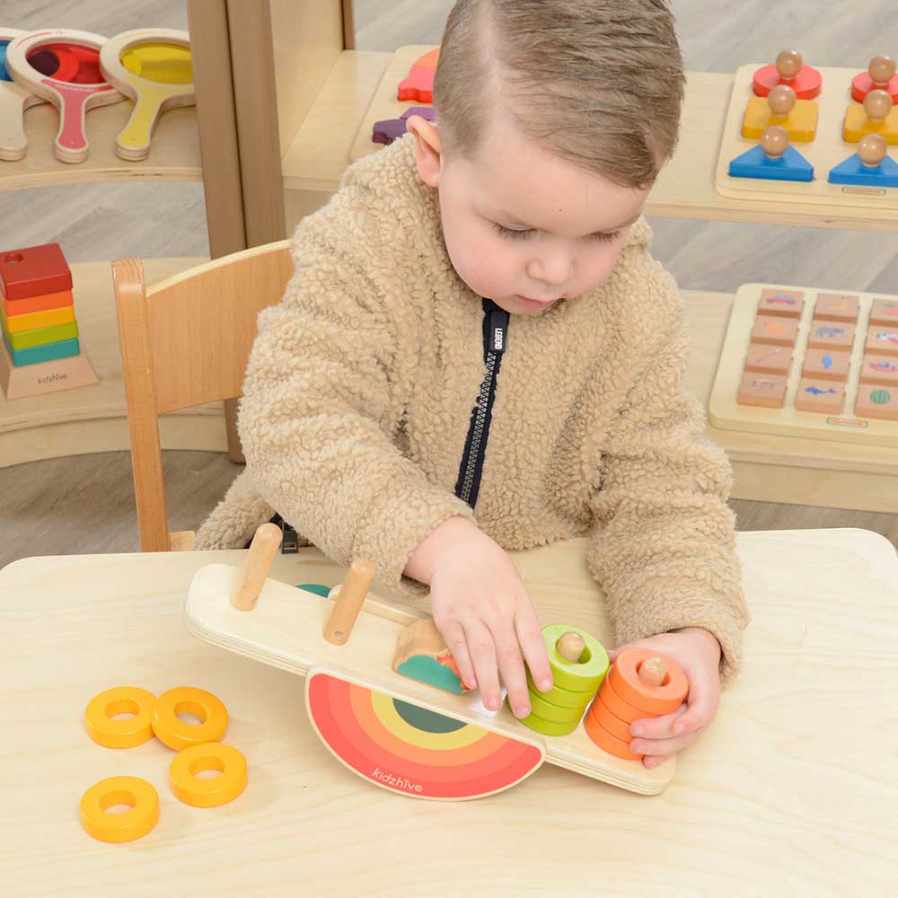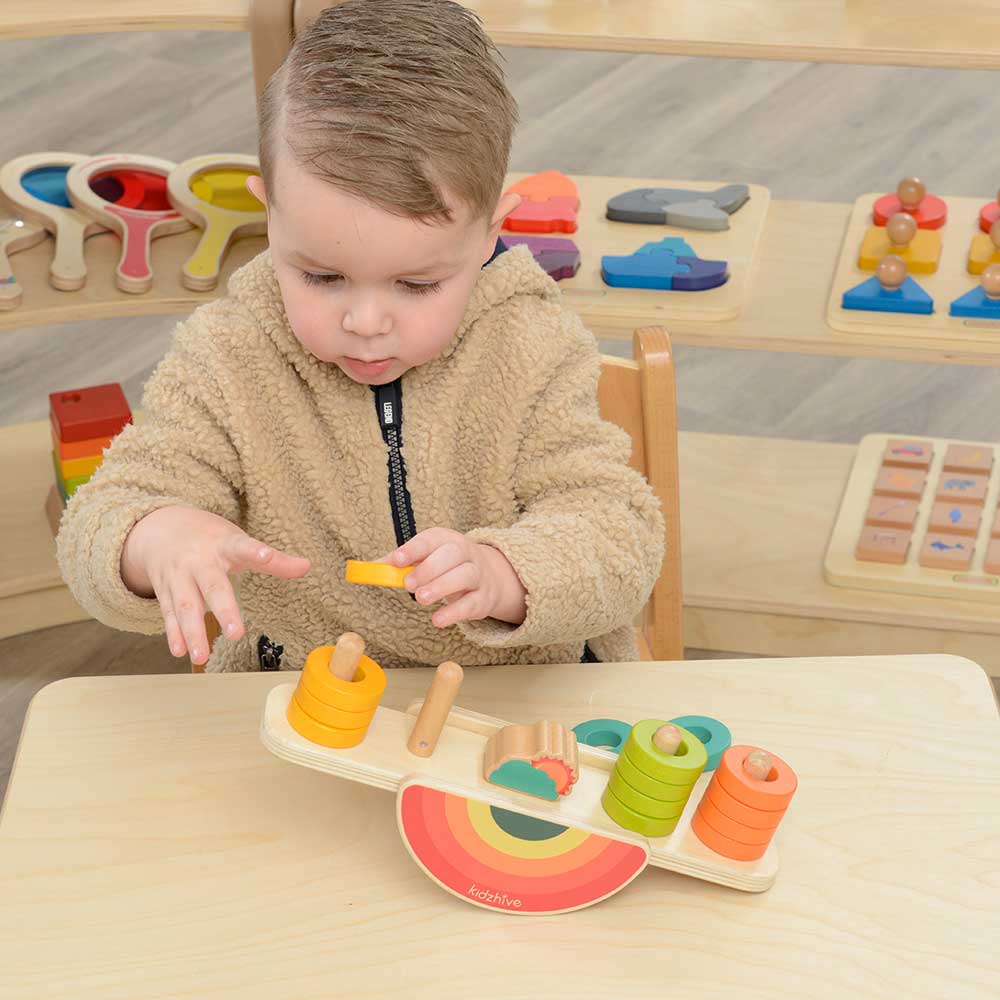 Picking and placing wooden rings onto the Balancing Rainbow (see-saw) is fascinating and the mathematics at play is very interesting too. Using this resource, the children will gain an insight into balance, symmetry and turning forces. The further the weight is placed away from the central balance point (fulcrum) the greater the turning force it exerts. So, placing different numbers of rings onto either end of the balance will provide interest and fascination to the children using it. When selecting pieces, children will be making choices, counting pieces and selecting colours as well as using mathematical language and developing their fine motor and coordination skills. An excellent mathematical puzzle for use by a single child or two children together. Can the Rainbow be made to balance (level) when there are different numbers of pieces on either end of it?