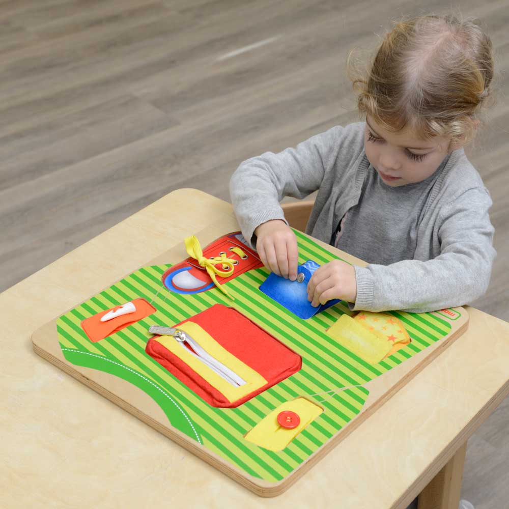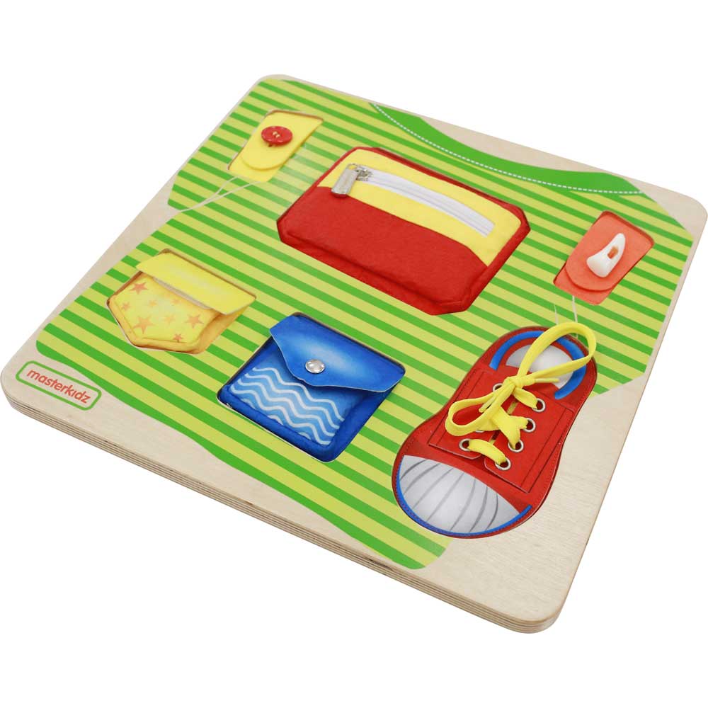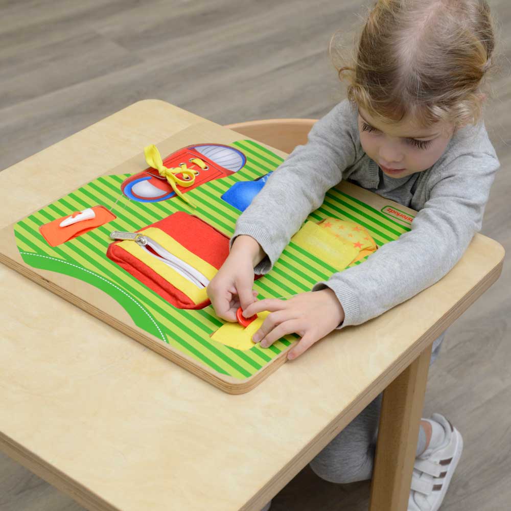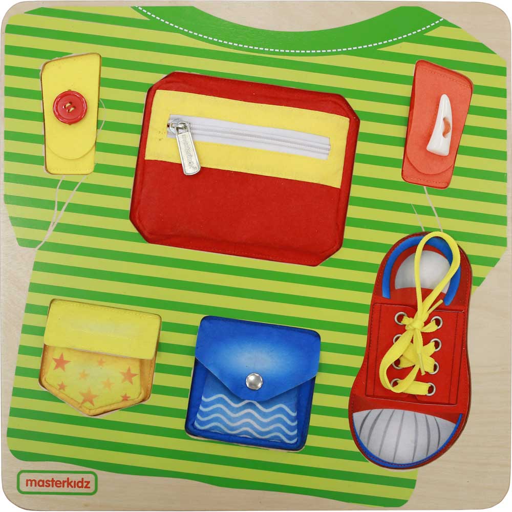 A beautiful and handy basic skills training board in themes of a T-shirt and a shoe encouraging fine motor skills development including zipper, button, toggle button, snap button, velcro closure and shoe tying.