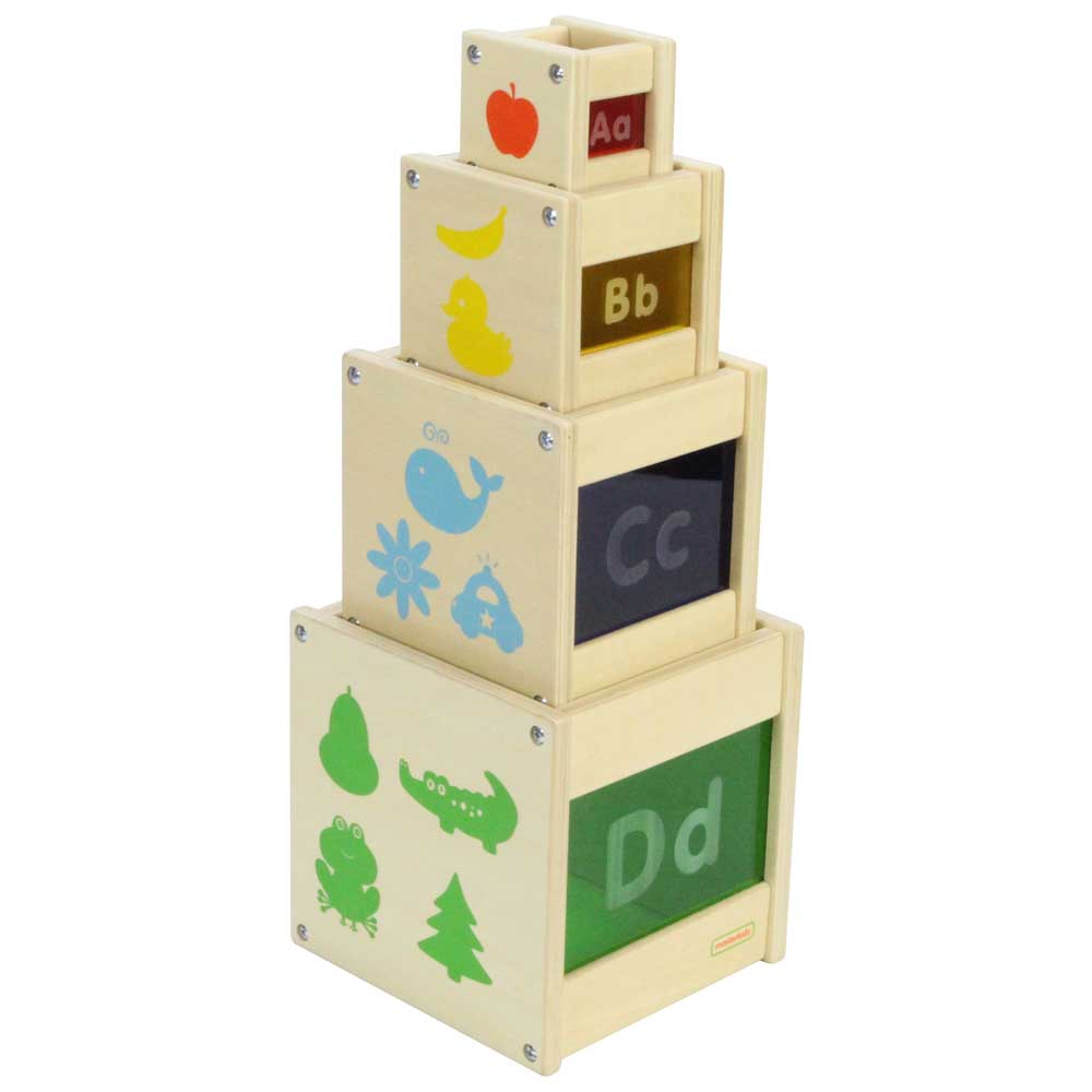 4 sturdy wooden nesting and stacking cubes printed with alphabets, numbers and shapes on the sides. A simple and classic educational toy for motor skills training, alphabets and numbers learning. Largest block measures 175 x 175 x 175mm. Made of European Beech Plywood.