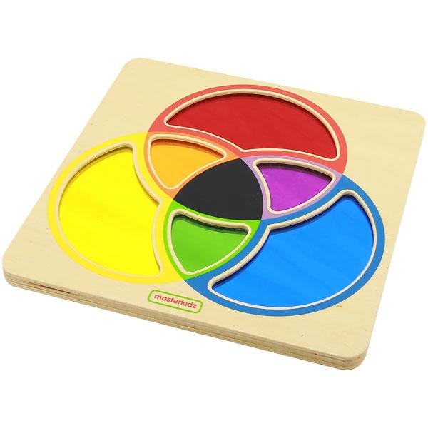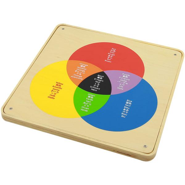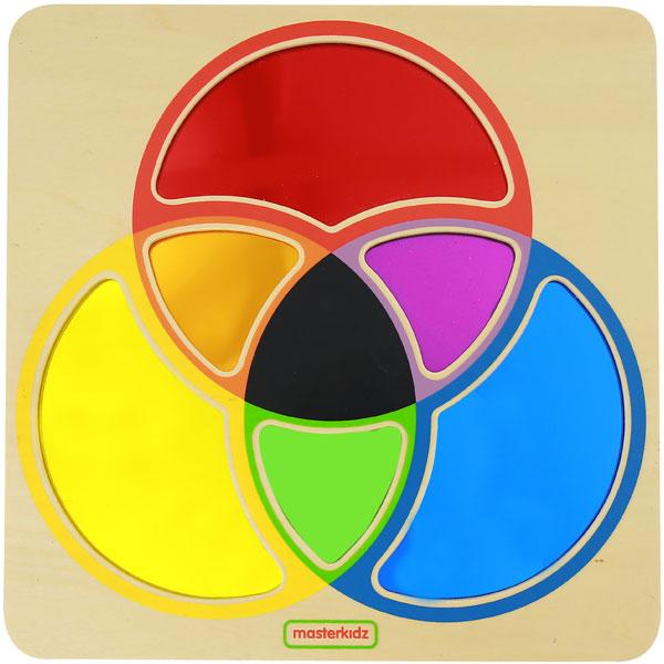 A self reflective colour mixing learning board allowing kids to learn about colour mixing. They can also look at their self-reflections in colours.