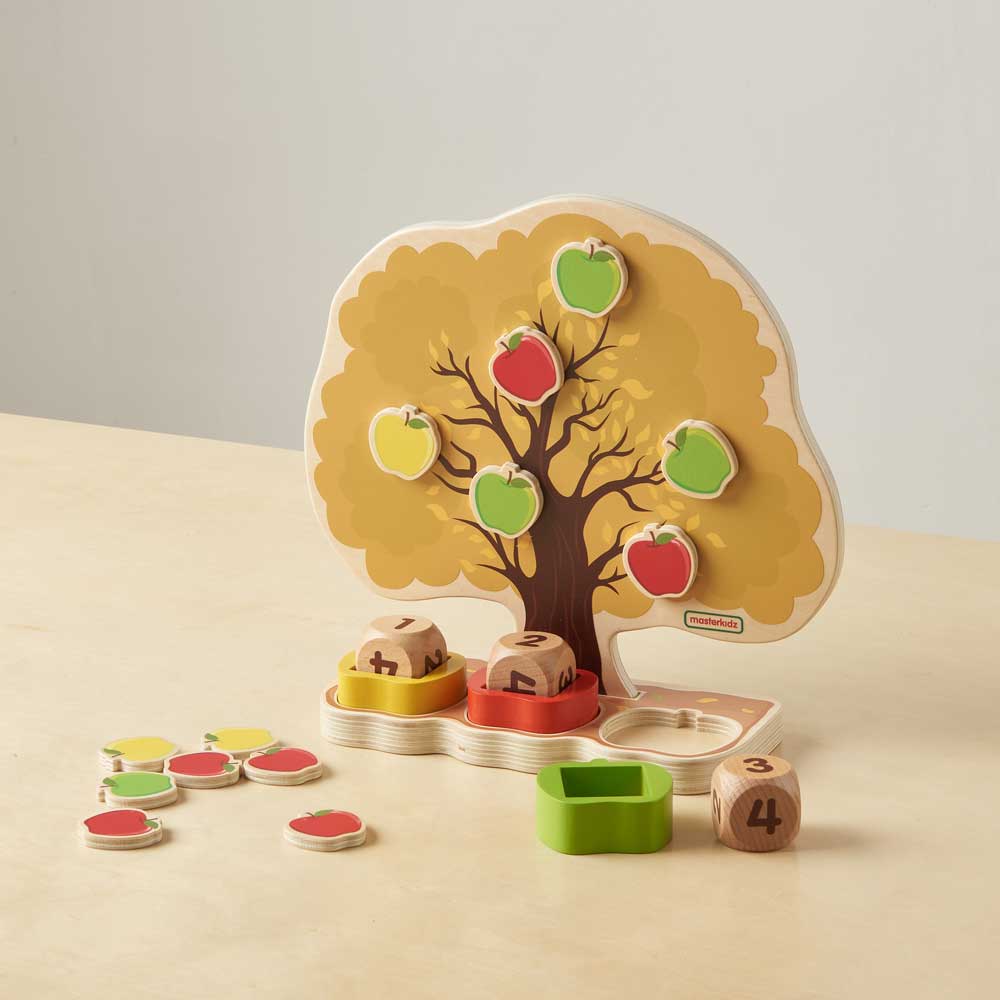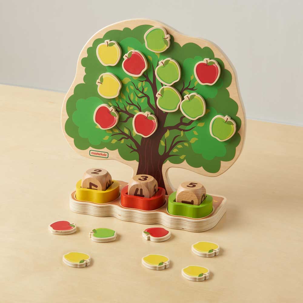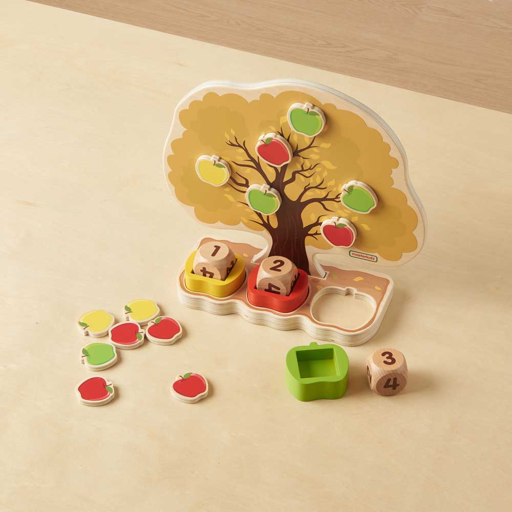 This wonderful numeracy resource is perfect for children who can count but are ready to take on the next mathematical steps such as addition, subtraction and number linked to quantity. The tree is magnetic and there are 18 apples (three sets of 6 apples in yellow, green and red). In addition, there are 3 dice, and for each dice there is a coloured dice holder which matches the colour of the apples. Used in open play the children can simply hang the magnetic apples randomly onto the apple tree and count them. They can count up to 18 or make apple patterns in 2s, 3s, 4s, 5s and 6s. Using the dice and coloured holders they can throw the dice to get allocated an instruction to pick and place 4 red apples, then the second dice 3 green apples, and finally using the third dice 6 yellow apples. Or they can play games in pairs adding and subtracting the number of apples the dice indicates. Many other mathematical computations can be played using this set such as working out the missing number. To do this they could start by placing a random number of apples onto the tree eg. 3 red apples, then throw the dice which gives 6. At this point they have to work out how many more apples they need to add to the tree to make 6. Great fun providing endless opportunities to perfect their mathematical numeracy and fluency.