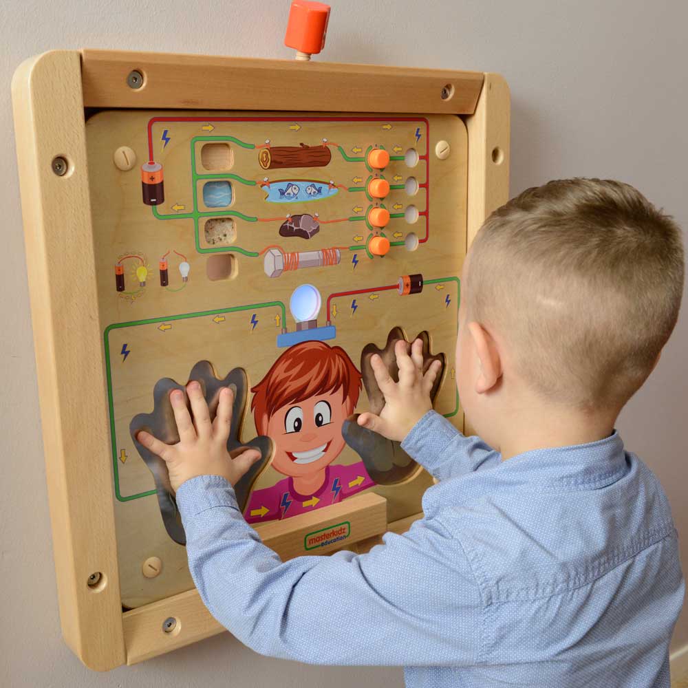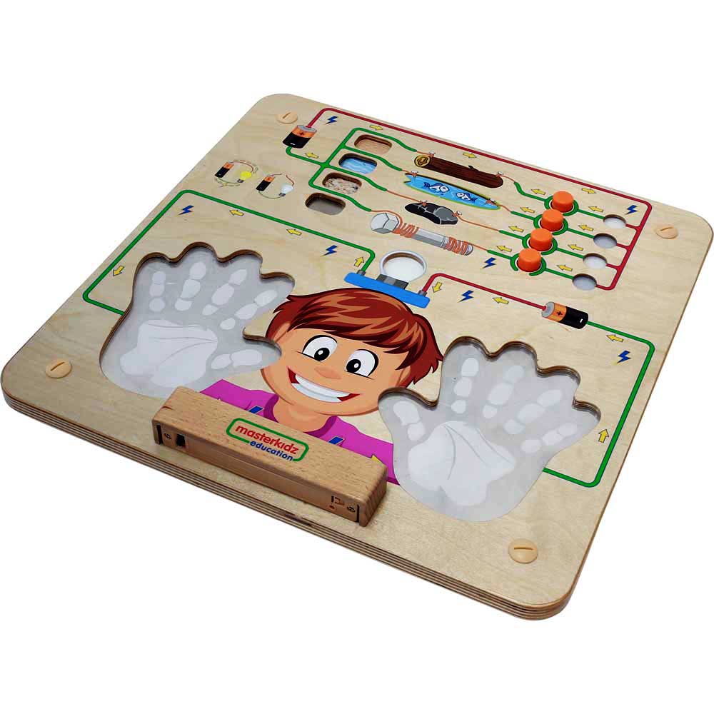 Electricity is the most versatile energy source that we have. Lights, fans, computers and most other electrical appliances are powered up by electric current. For an electric current to happen, there must be a circuit. A circuit is a closed path or loop around which an electric current flows. This Conductivity Experiment wall panel comes with 2 electric circuits. The circuit on the upper part is still an open circuit requiring children to make it a closed circuit by pressing one of the 4 buttons. Each button represents 1 type of material of different conductivity. If plastic or tile is chosen, the light won't be turned on because electric current cannot pass through insulating materials. Another circuit is also an open circuit. Children will be asked to use their bodies as connectors to make it a closed circuit. When a child put both hands on the panel, the light will turn on! Children will be amazed by this phenomenon. Teaching them human bodies are electric conductive cannot be easier.