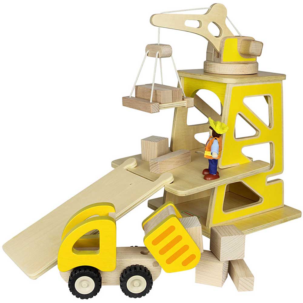 Sturdy wooden construction site featuring a tower crane with a movable working platform. Workers will be busy controlling the crane and moving the building materials and debris. Made of sustainable European beech and plywood.