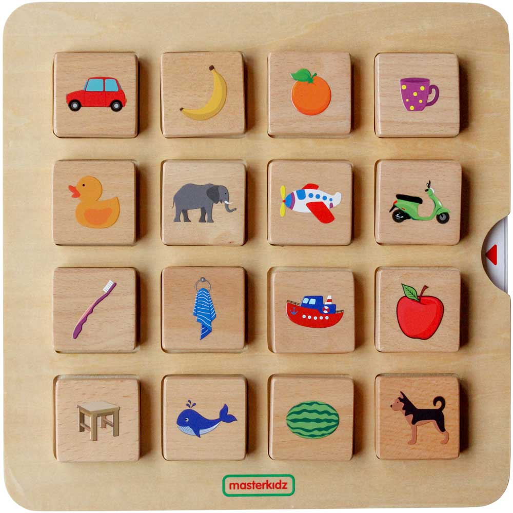 This pairing game encourages the development of children's visual recognition skills of common objects. Children are asked to pair up objects that are presented (1) with details and colours, (2) with no colour and details and (3) in their contours. Through repetitive play, children will be able to learn to identify or match up objects through their abstract representations. Includes 4 changeable themes.