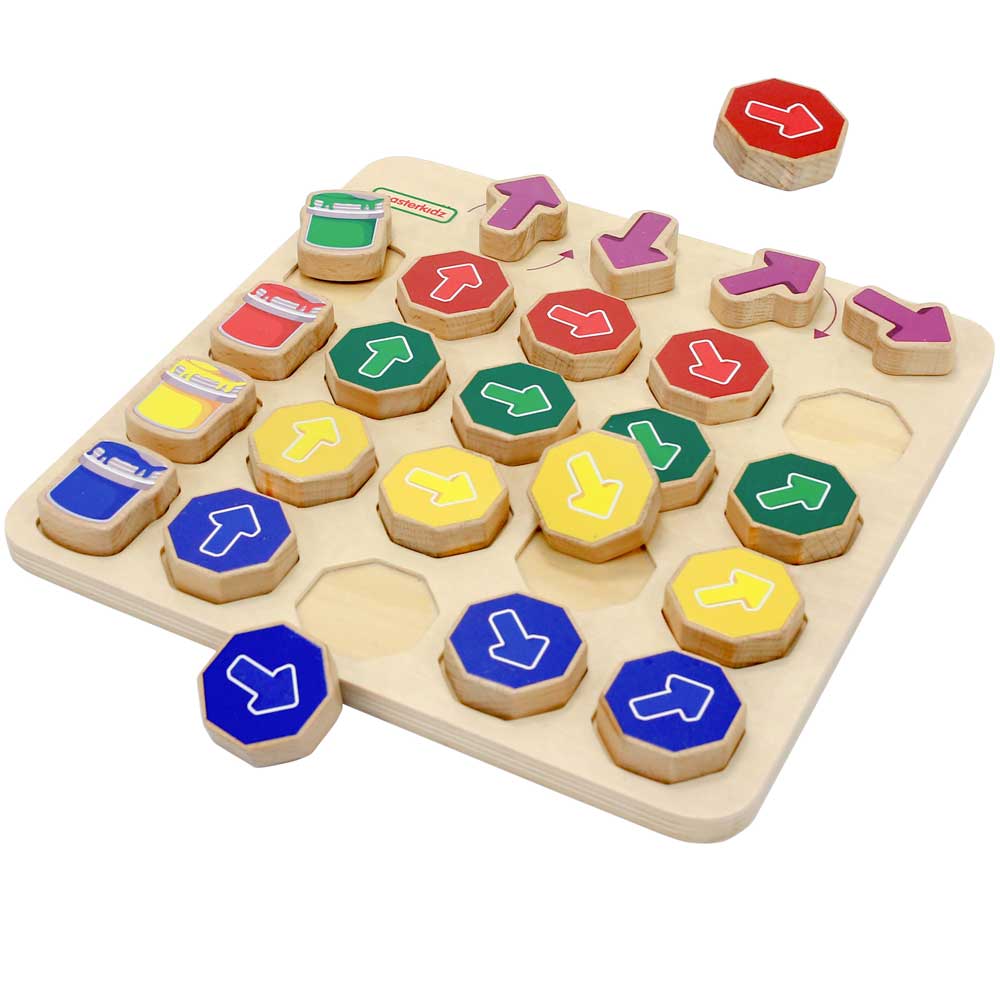 Development of sense of direction is important in early learning. It is related to cognitive maps, spatial awareness, and spatial cognition. Children with a good sense of direction will be able to know one's location and perform wayfinding. This Directions and Colours Learning Game encourages development of sense of direction and colour recognition skills. To play, teachers randomly place the colour buckets on the left column and turn the purple arrows on the top row to different directions. Children then need to place the 16 coloured hexagonal arrow blocks in the matching directions and matching colours.