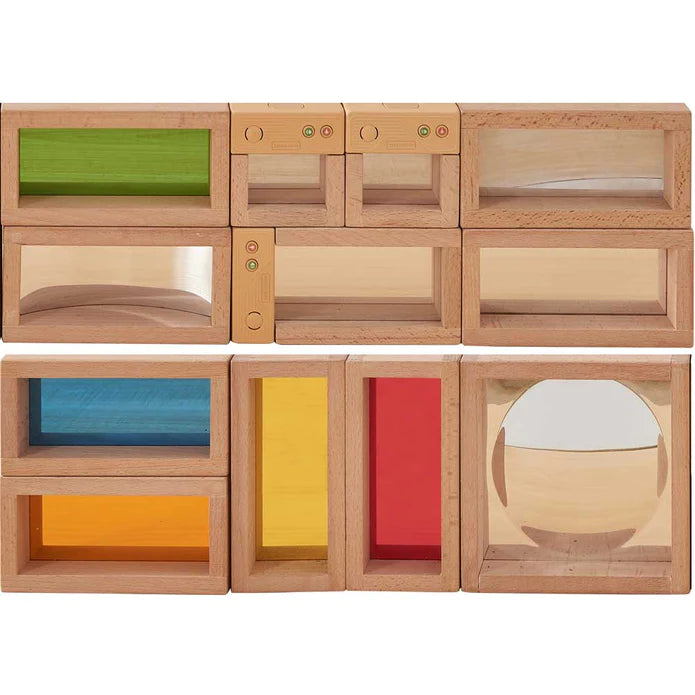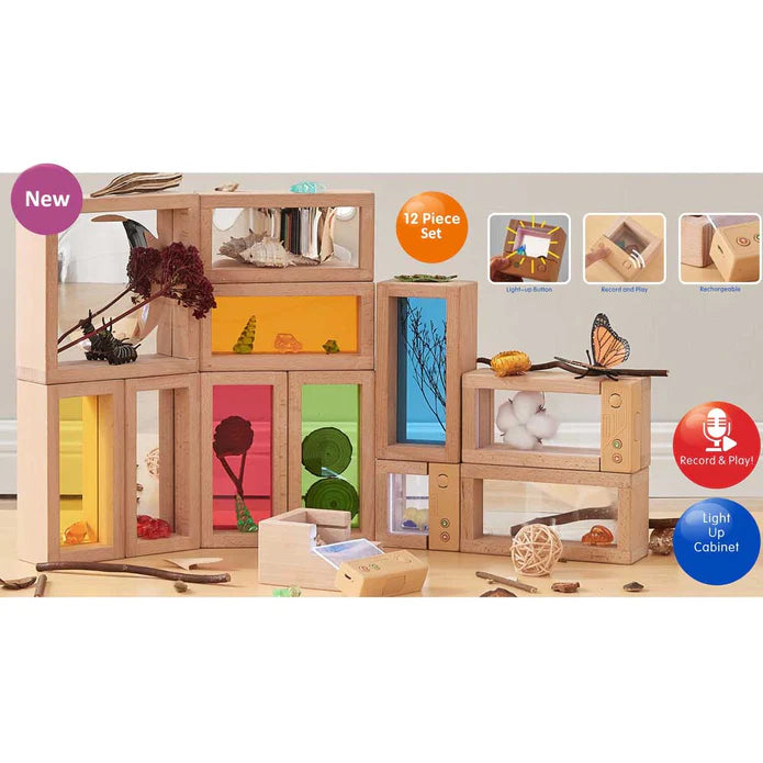 This discovery block set includes 3 Record ‘N Talk Discovery Light-Up Blocks, a Concave-Convex Mirrored Block, a Plastic Magnifier, a Bent Mirror Block, a Double-Sided Mirror Block and 3 Translucent Blocks. It is an ideal discovery and sensory toy encouraging curiosity, development of visual sensory skills and self confidence. Children can put a lovely ladybug or a snail they catch from the outdoors inside the Record ‘N Talk Discovery Light-Up Blocks for observation. They can also press the light button to highlight what’s inside.