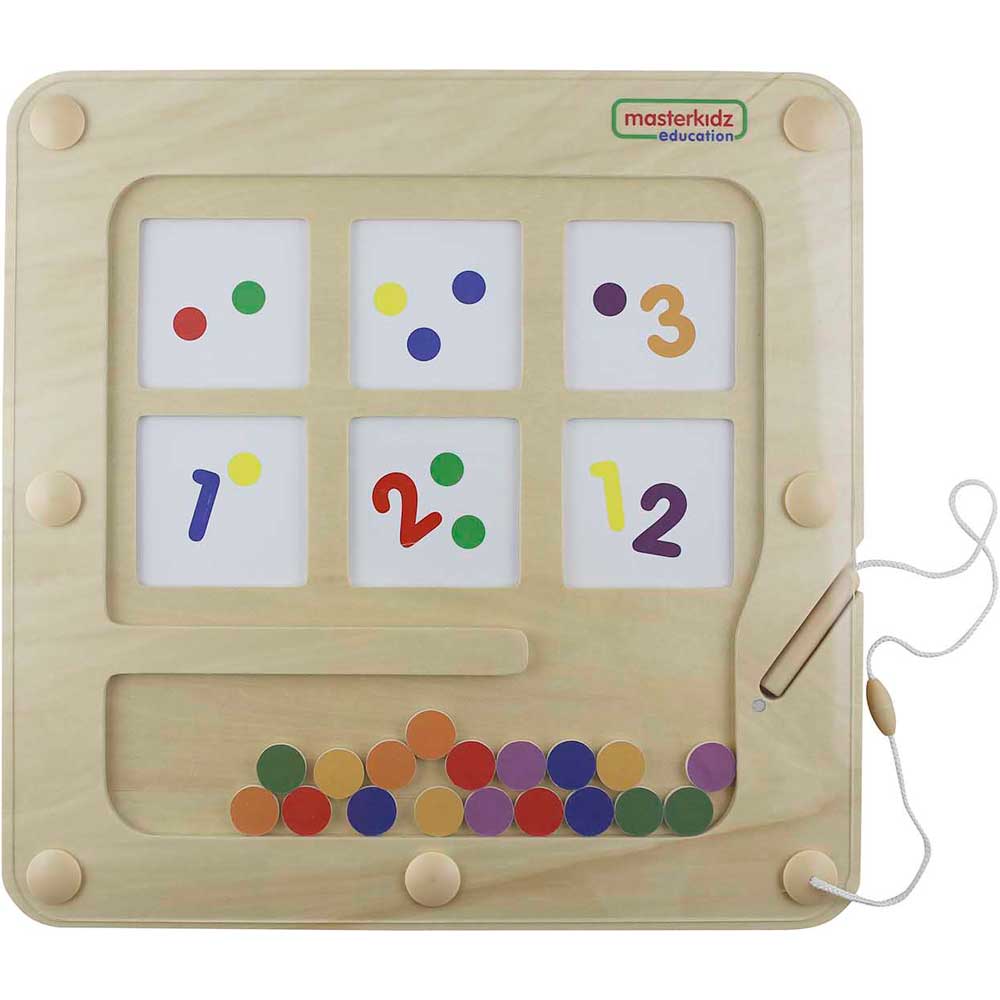 The Number and Colours Matching Magnetic Maze reinforces numbers and quantities learning as well as colour recognition skills. Provided with 6 different inserts, children will be asked to place the matching colour pieces. At the advanced level, higher logical thinking skills are required as children will not be given given direct clue on solving the question. For example, when a RED arabic number 3 is shown, children will need to place 3 red pieces into the slot.