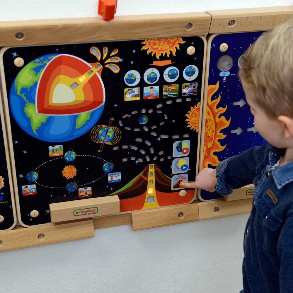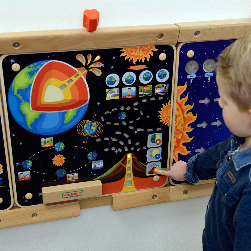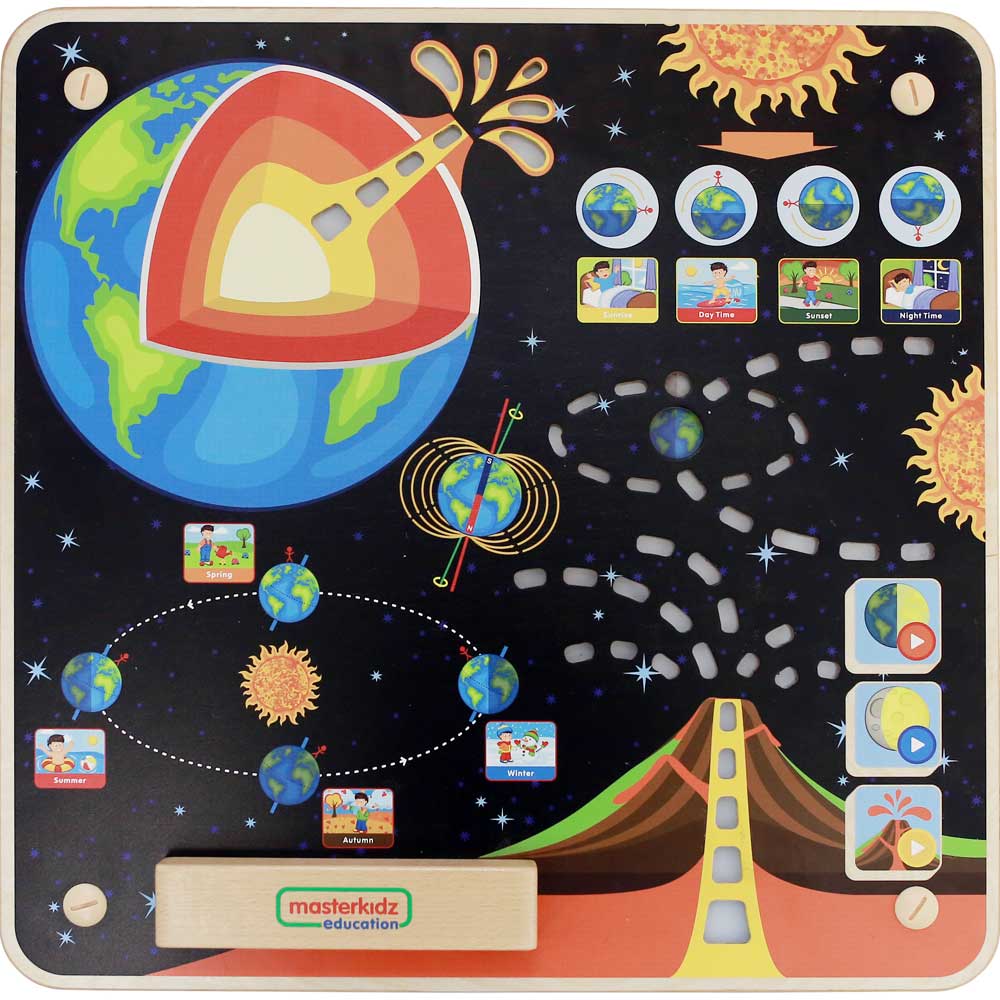 Earth is the only planet known to have current geological activity, like earthquakes and volcanoes. It is the only planet known to have life. Earth has one natural satellite, the Moon, which is the only large satellite of a terrestrial planet in the Solar System. This learning board demonstrates how moon orbits earth and how earth orbits sun. It also explains why we have day and night in a day and why there are four seasons in a year. The learning also shows the inner structure of the earth and demonstrates what happens inside a volcano when it erupts. Special lighting effects are used for better demonstration of orbiting and volcano eruption.