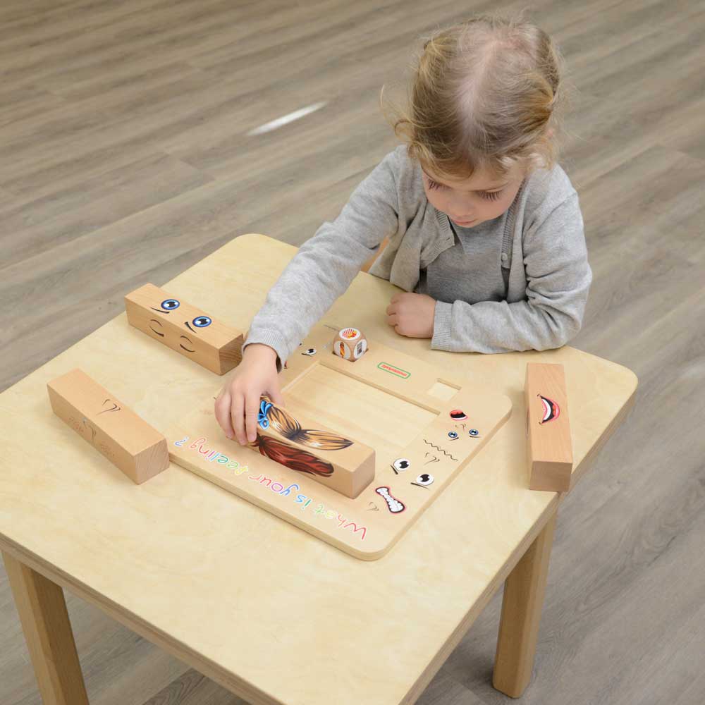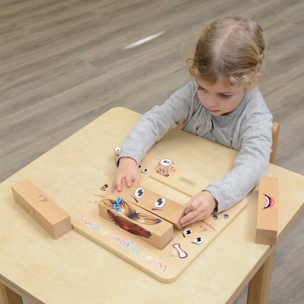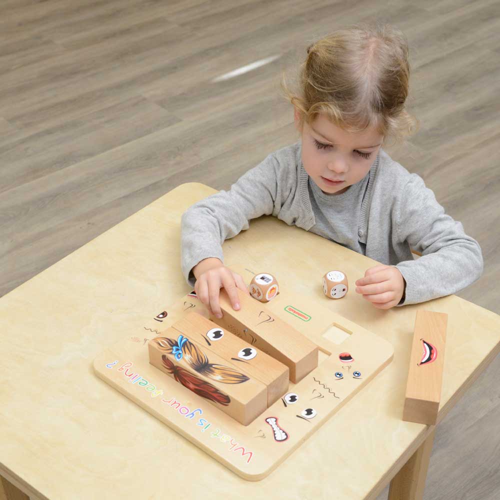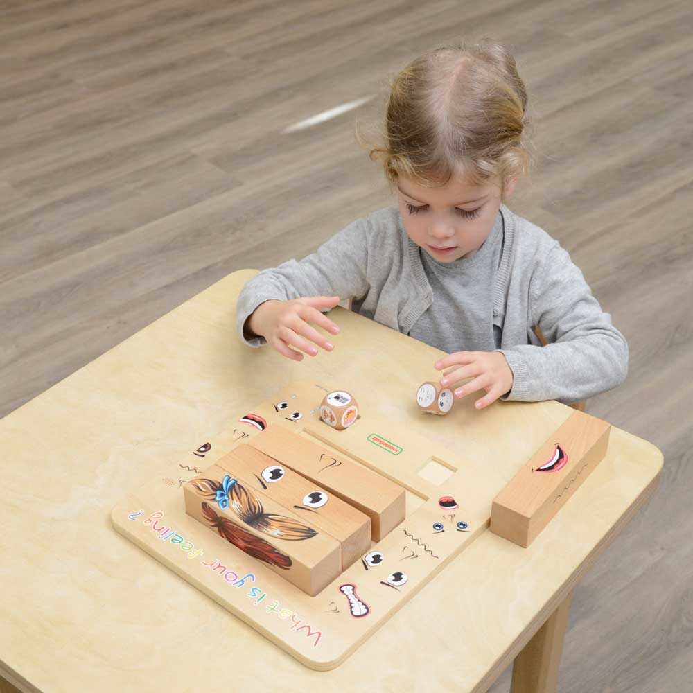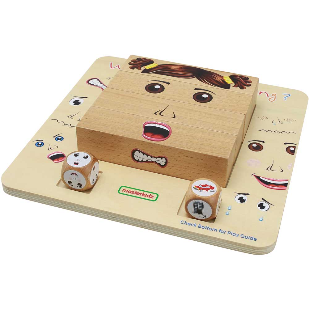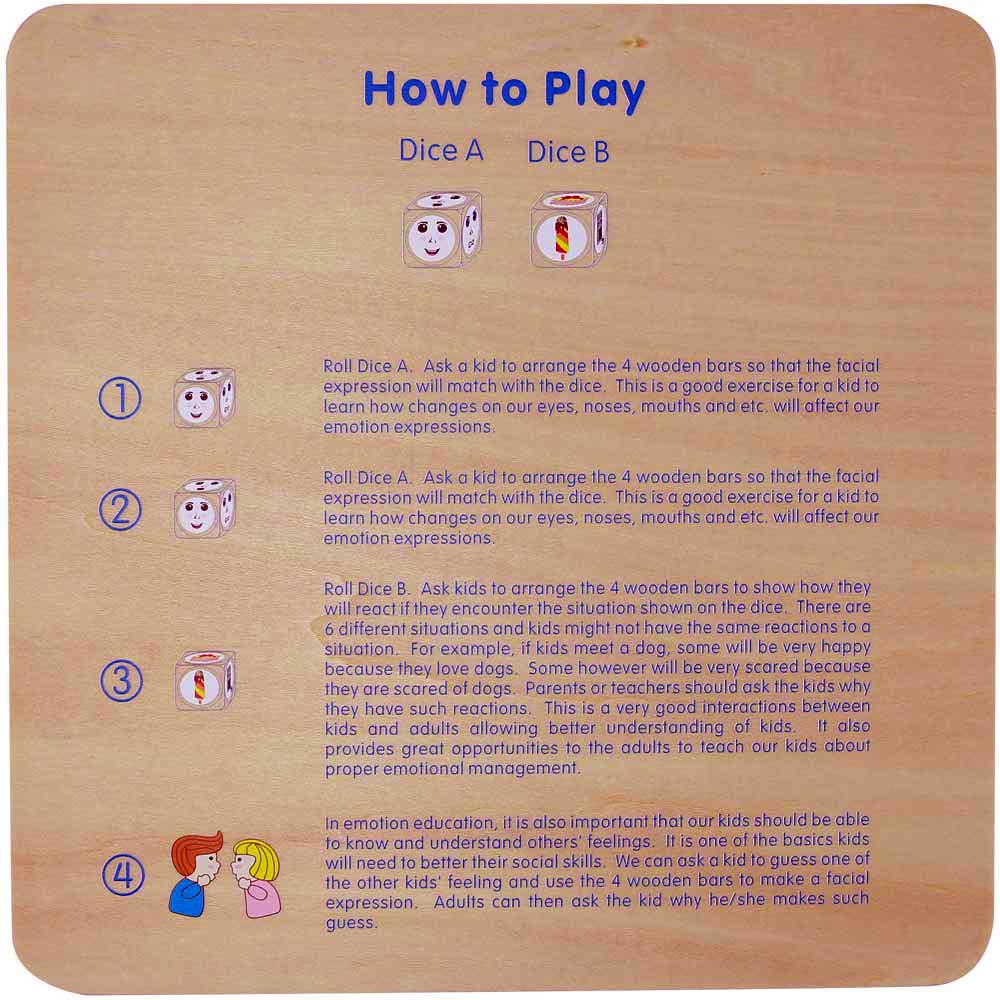 This is a set of 4 bars printed with different facial expressions. Children can make up to 64 different emotion expressions. It helps soothe and validate children when they are in negative moods. It also encourages emotion literacy and development. Great for social stories and imaginative play. With the toy, adult can watch children talking about their inner world and feelings. Comes with 2 play dice allowing various types of play and learn.