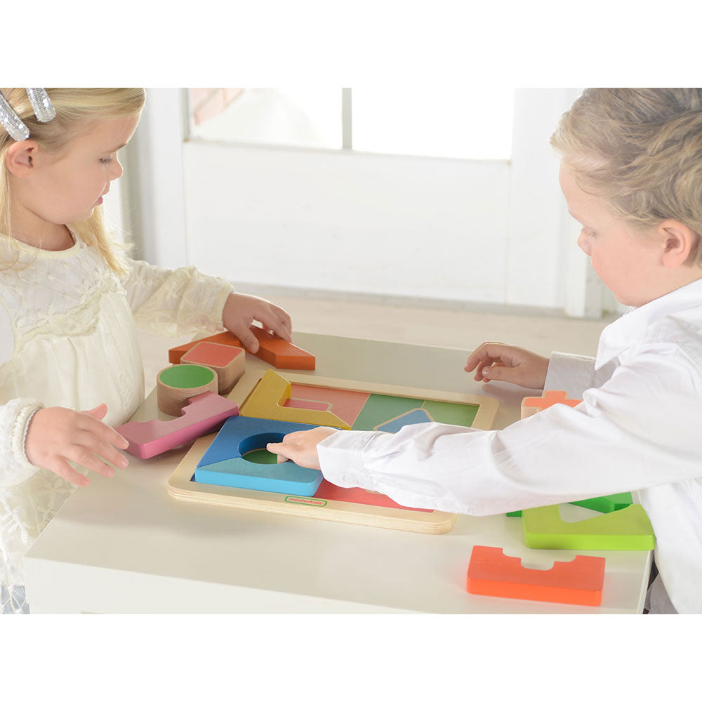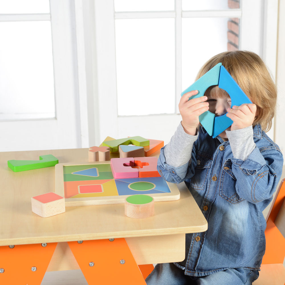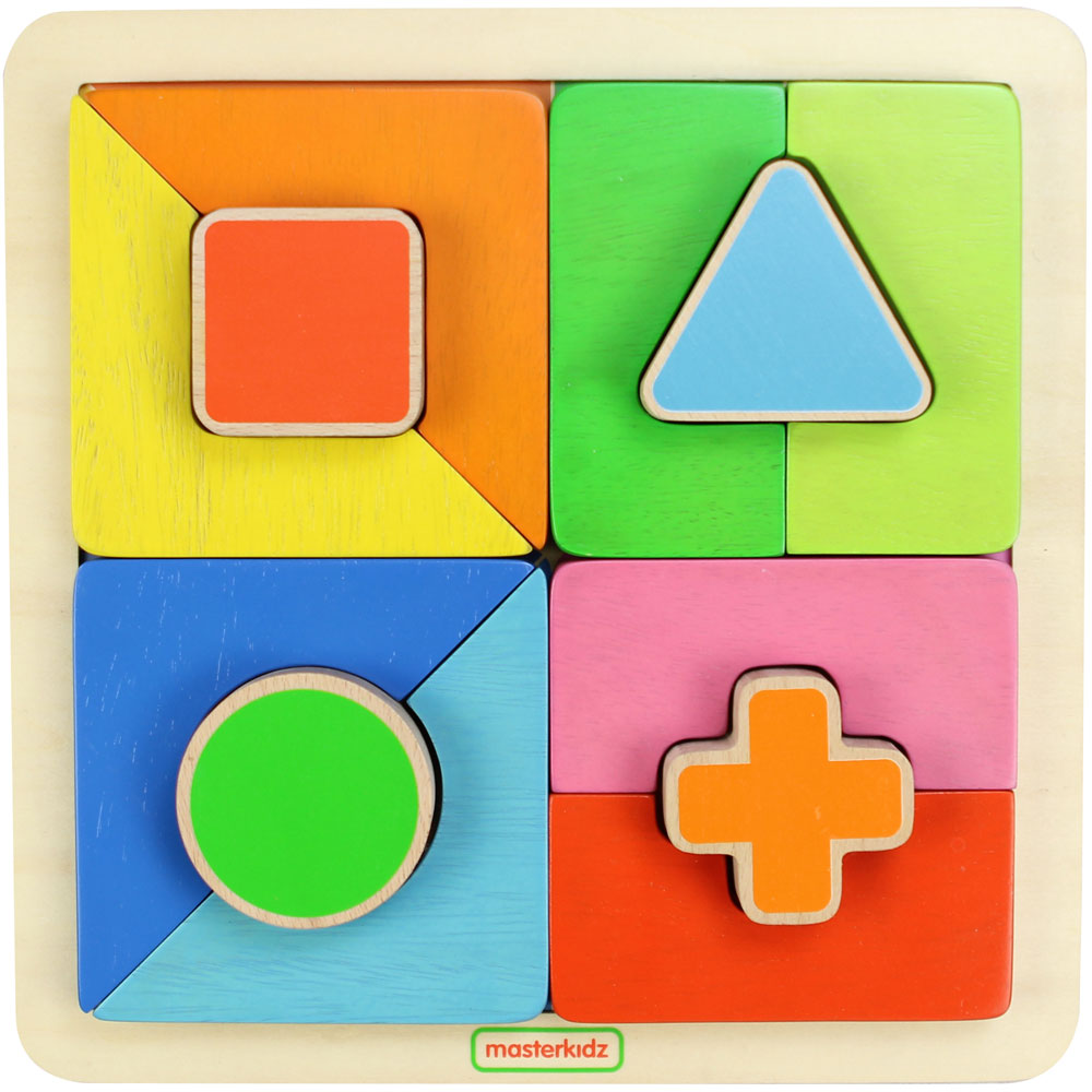 There are 4 basic shapes placed in 4 squares in this toy. Kids will be required to place a total of 12 pieces different wooden blocks into the right positions. A good color matching, shape matching and logical training toy. All wooden blocks are made of sustainable Beech Wood.