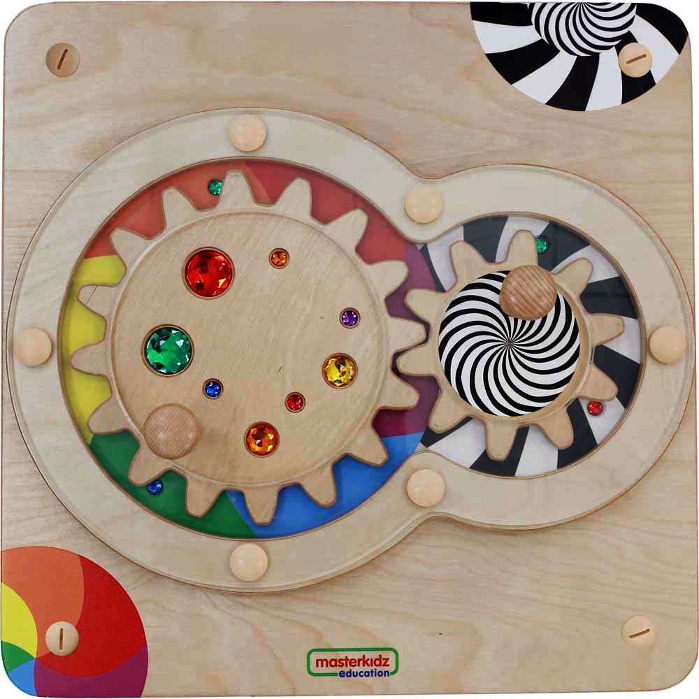 This is a simple hand coordination training gear board with one big and one small gear. Player will hold the handles with both hands and turn simultaneously. Each gear wheel will rotate at different speeds. Colourful gemstones on each gear wheel also provide extra visualstimulation. An excellent toy for left and right brain coordination skills training.