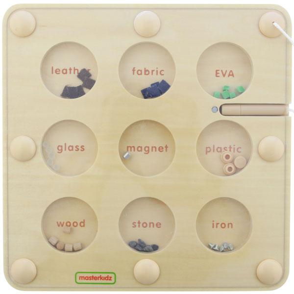 A board containing 9 different type os materials kids can often see around them. Kids will use the magnetic pen to see which of them will react to magnet. A simple and good experiencing toy for kids who are first learning about magnetism.