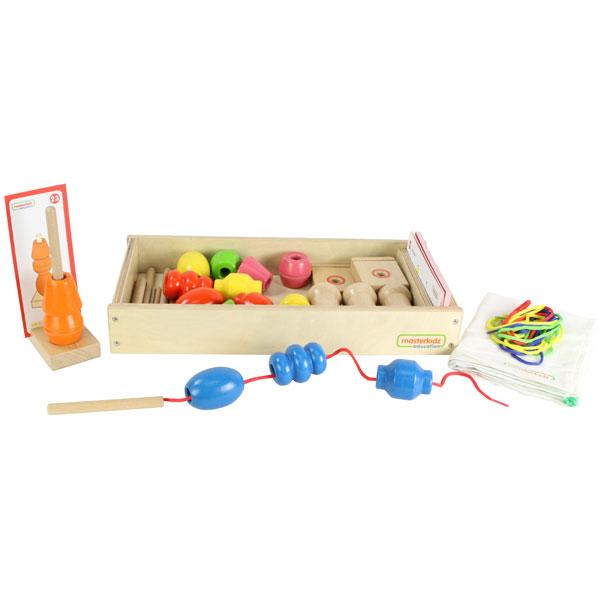 A variety of solid wooden beads for sorting, counting, matching. Three different sets each come complete with 4 wooden threading stands and 8 double sided workcards to provide 16 logical combination exercises. Each set also includes coloured threading laces for simple activities. Each set includes a playguide with various coded levels and games suitable for most kids. A fabric bag is also provided for each set. Each set is made from quality Beech Wood wood(FSC).
