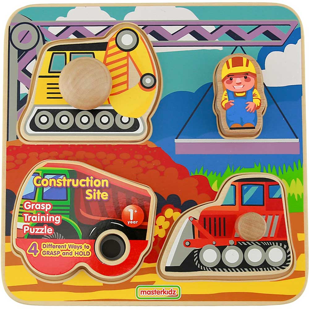 This oversized wooden Construction Site Knob Puzzle features bright colours with easy grip extra thick pieces. Four types of fine motor skills are exercised. Pieces are gripped by either a jumbo knob, dowel, open circle or the solid piece. Full-colour with matching pictures beneath each piece. A great dexterity activity to encourage eye-hand and visual perception skills.