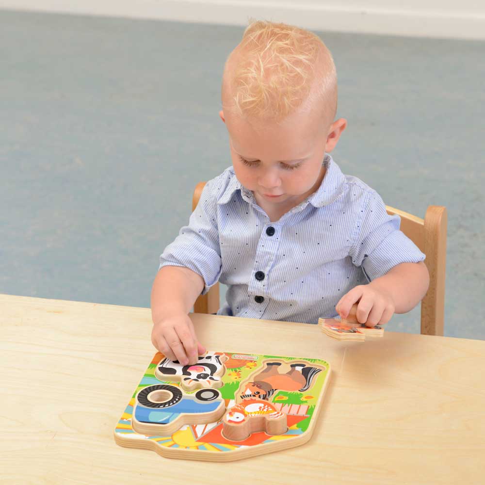 This oversized wooden Farm Knob Puzzle features bright colours with easy grip extra thick pieces. Four types of fine motor skills are exercised. Pieces are gripped by either a jumbo knob, dowel, open circle or the solid piece. Full-colour with matching pictures beneath each piece. A great dexterity activity to encourage eye-hand and visual perception skills.