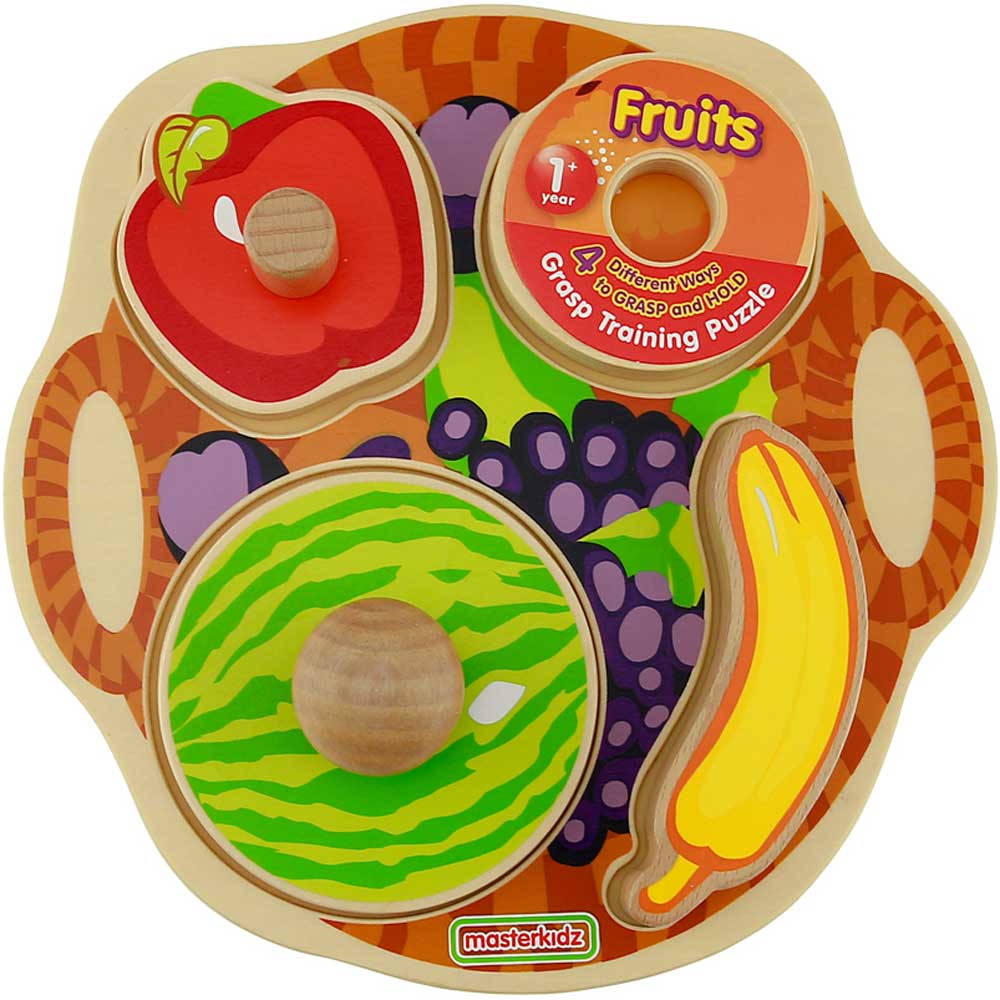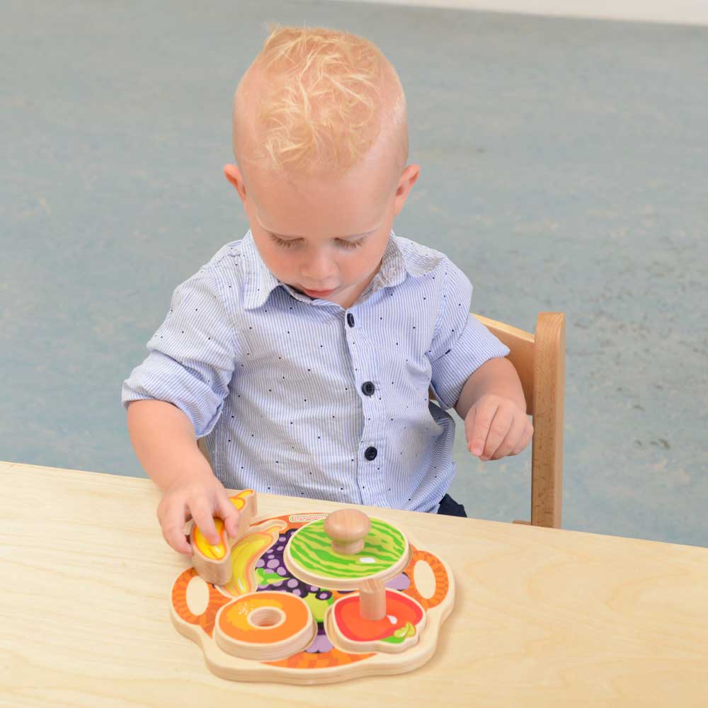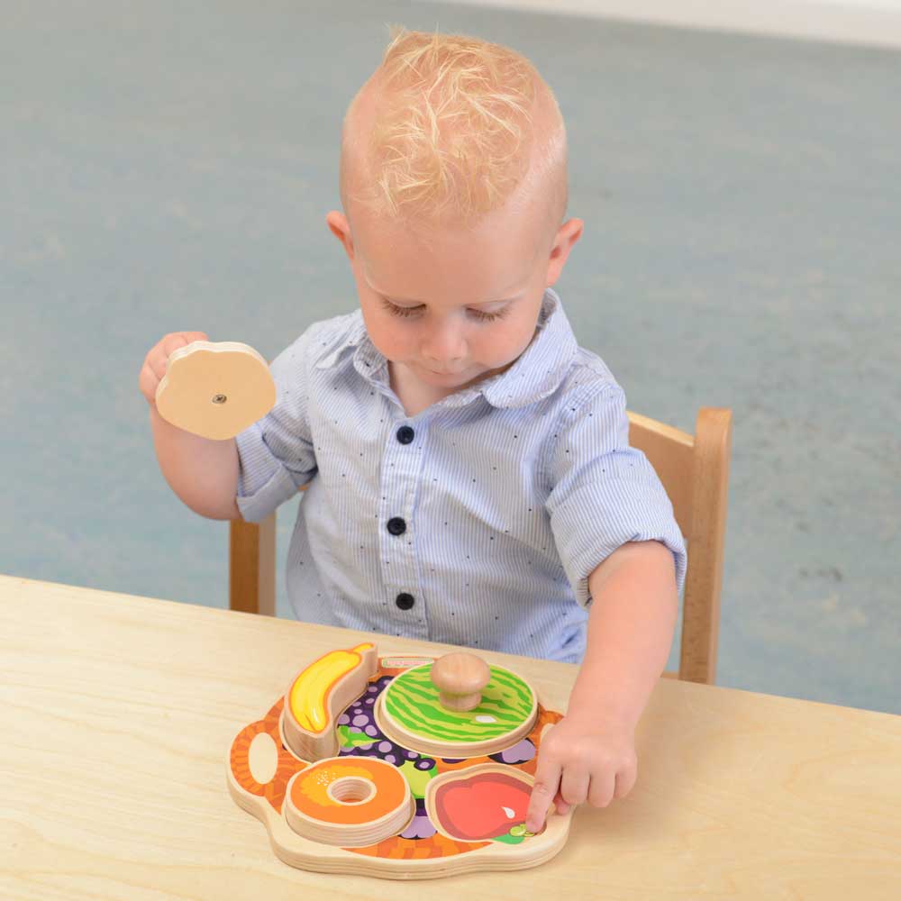 This oversized wooden Fruit Knob Puzzle features bright colours with easy grip extra thick pieces. Four types of fine motor skills are exercised. Pieces are gripped by either a jumbo knob, dowel, open circle or the solid piece. Full-colour with matching pictures beneath each piece. A great dexterity activity to encourage eye-hand and visual perception skills.