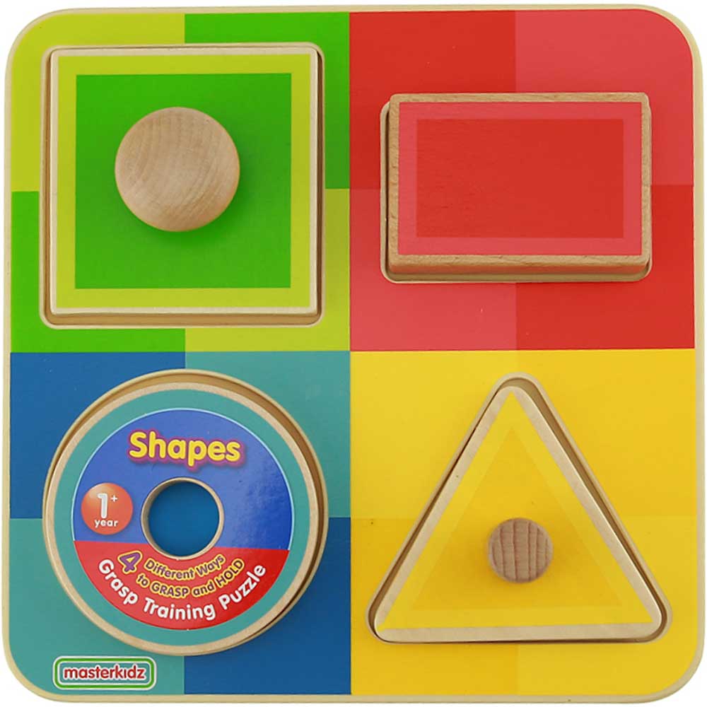 This oversized wooden Shapes Knob Puzzle features bright colours with easy grip extra thick pieces. Four types of fine motor skills are exercised. Pieces are gripped by either a jumbo knob, dowel, open circle or the solid piece. Full-colour with matching pictures beneath each piece. A great dexterity activity to encourage eye-hand and visual perception skills.