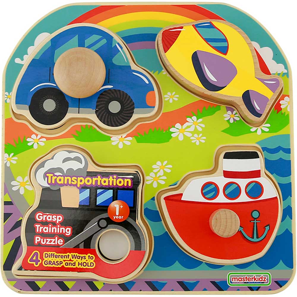 This oversized wooden Transportation Knob Puzzle features bright colours with easy grip extra thick pieces. Four types of fine motor skills are exercised. Pieces are gripped by either a jumbo knob, dowel, open circle or the solid piece. Full-colour with matching pictures beneath each piece. A great dexterity activity to encourage eye-hand and visual perception skills.