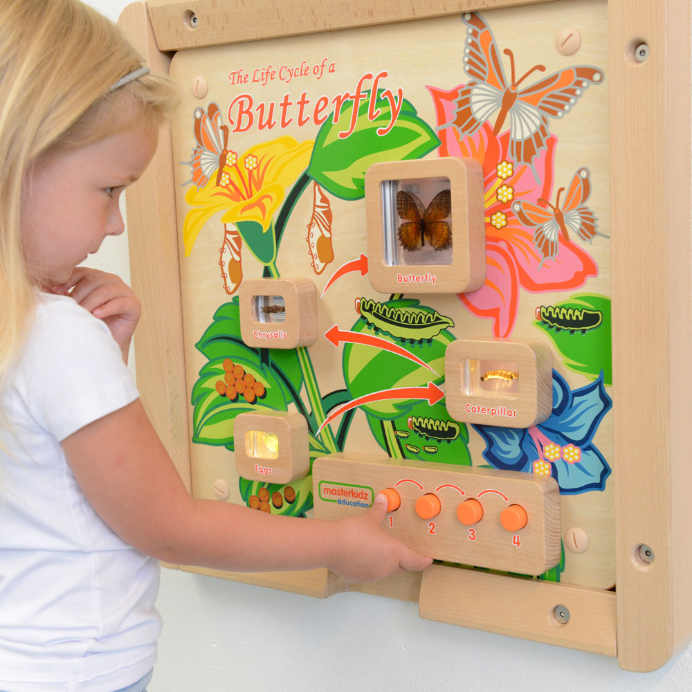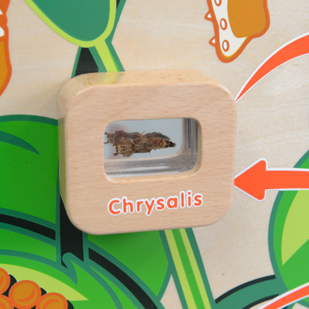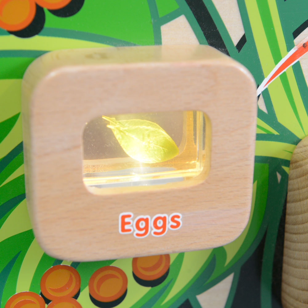 The metamorphosis of the caterpillar into the butterfly remain one of nature’s greatest wonders. This is a butterfly life-cycle learning board containing real life specimens encapsulated in clear acrylic blocks which allow children to have closer look. The 4 stages including Eggs, Caterpillar, Chrysalis and Adult Butterfly can be seen and discussed with the added benefit of switches to light up each one in turn. Once lit-up, the specimens reveal all of their hidden secrets and children will be drawn in to examine them in greater detail. As well as the visual brilliance of these boards, children will also benefit from the rich words and language that surrounds these wondrous timelines. Batteries are not included.
