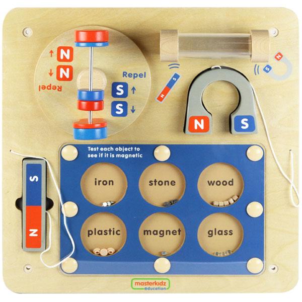 Using this board, children can experience magnetism. There are several differently shaped magnets so that children can feel attraction and repulsion. They can see the effect of magnets in suspension held by ‘like poles repelling each other’ - even against the force of gravity when the wheel is rotated. A clear window tube has iron filings that can be made to stand up to reveal magnetic lines of flux and a variety of magnetic and non-magnetic materials can be tested with a magnet.