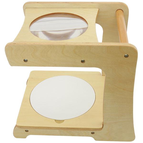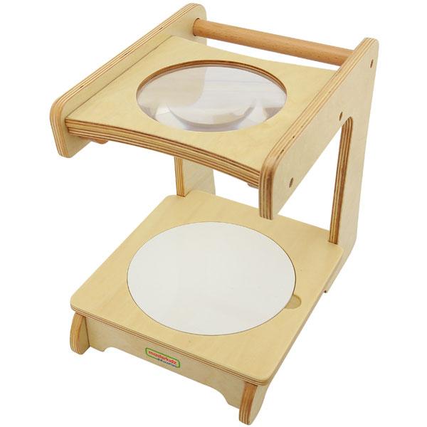 This sturdy wooden magnifying stand is designed to provide observation on grand scale. The new generation is featured with optional transparent stage so that it can be placed on a light box for better lighting. The extra-large maginifier (3x) is ideal for taking closer look at insects, rocks, fabric and more. Made from Russian Birch plywood.