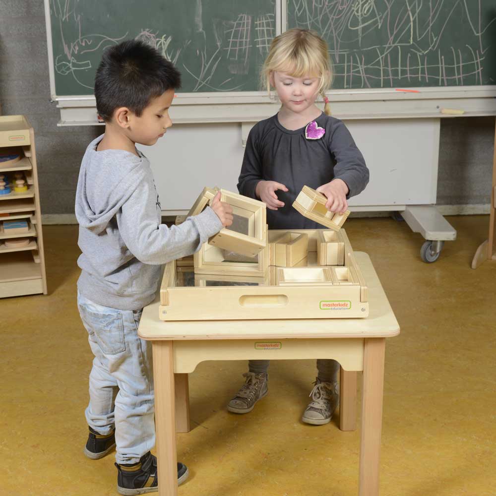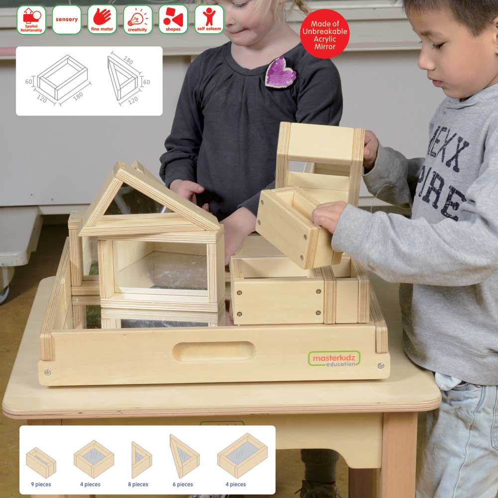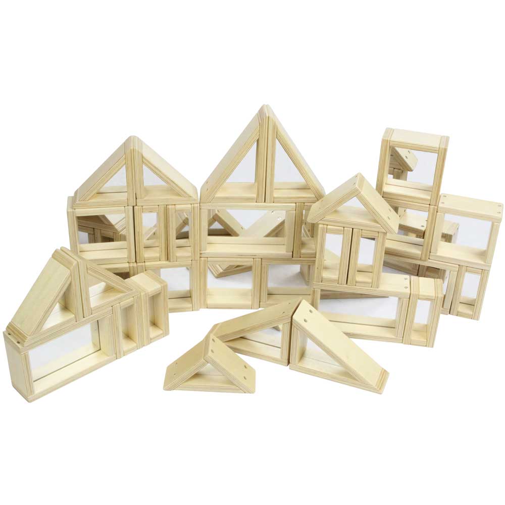 A set of wooden blocks with double sided acrylic mirror centres. Children can create endless designs, use the mirrors to investigate and explore. A lovely sensory item where children can understand shape recognition, size and logic and develop fine motor skills. Set of 31 blocks made from European Birch plywood in a variety of shapes and sizes. Each block is durable and FSC approved. Tray is available separately.