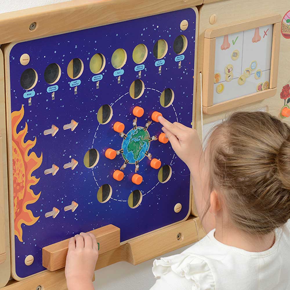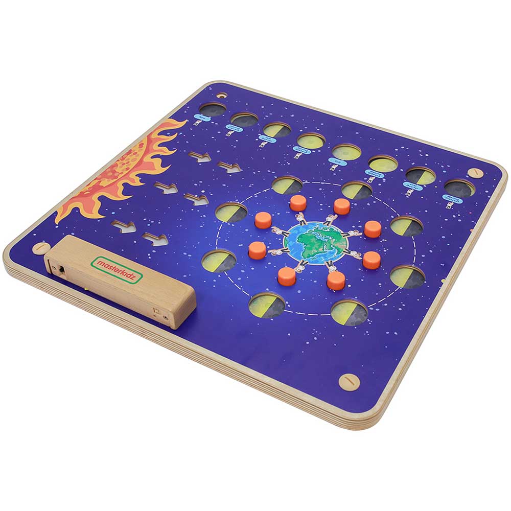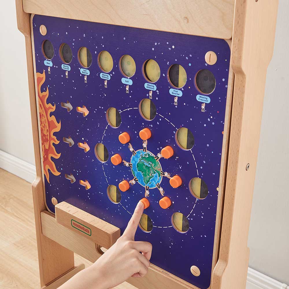 The interactive learning board has buttons and when pressed they light-up the phase and name of the moon type and show the Moon’s position relative to the sun. Children will find this fascinating.