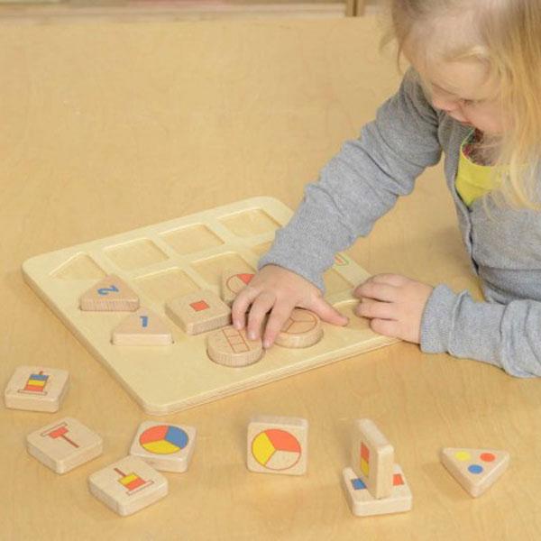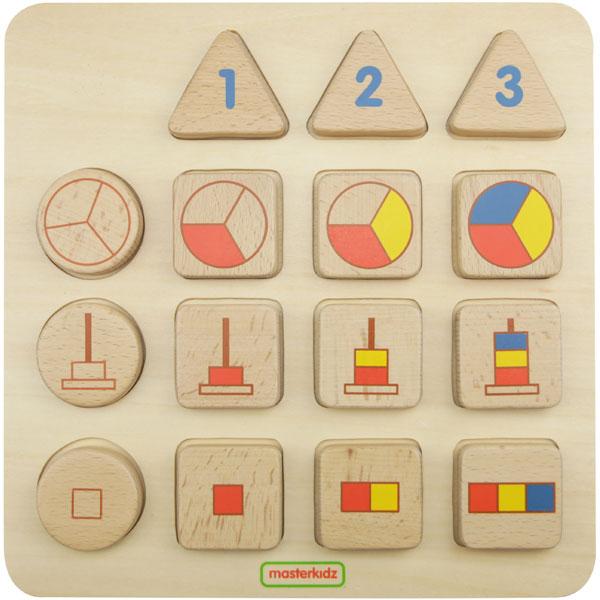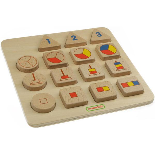 The 3 triangular blocks on the top row represent numbers 1, 2 and 3. The 3 round blocks on the left column represent 3 different representations of numbers. To play, teacher or parent can use any one of the 3 round blocks and the 3 triangular blocks, and ask the kid to match the square blocks with the number blocks. Or, to place all 3 triangular blocks and all round blocks on the board, ask the kid to place all 9 square blocks at the right positions. A perfect toy for quantity learning, number representations learning and logical thinking skills development.