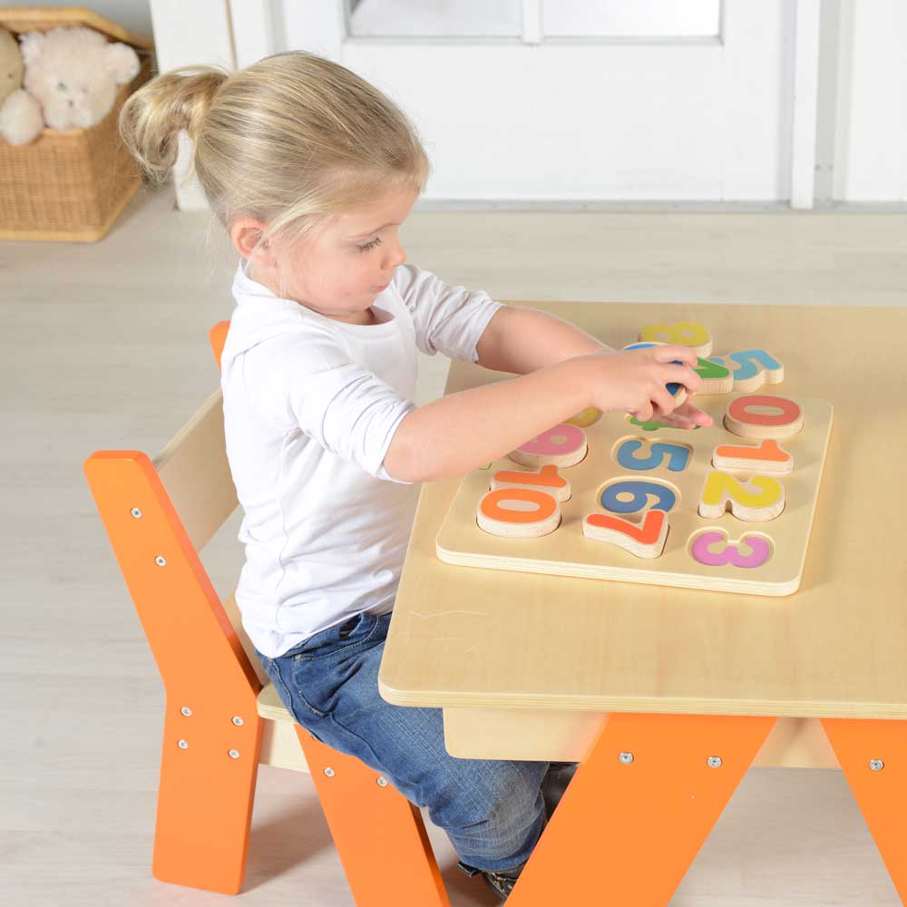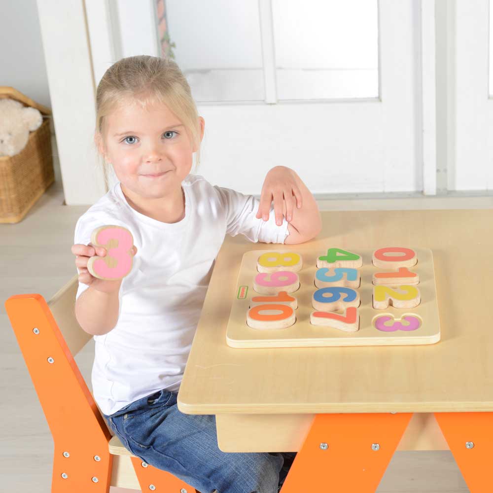This set of chunky wooden numbers is for teaching young ones basic numbers 1 to 10. It provides an interactive, hands-on way for children to learn about numbers, shapes and colours through sequencing. The chunky puzzle numbers are rounded and made of sustainable European Beech Wood.