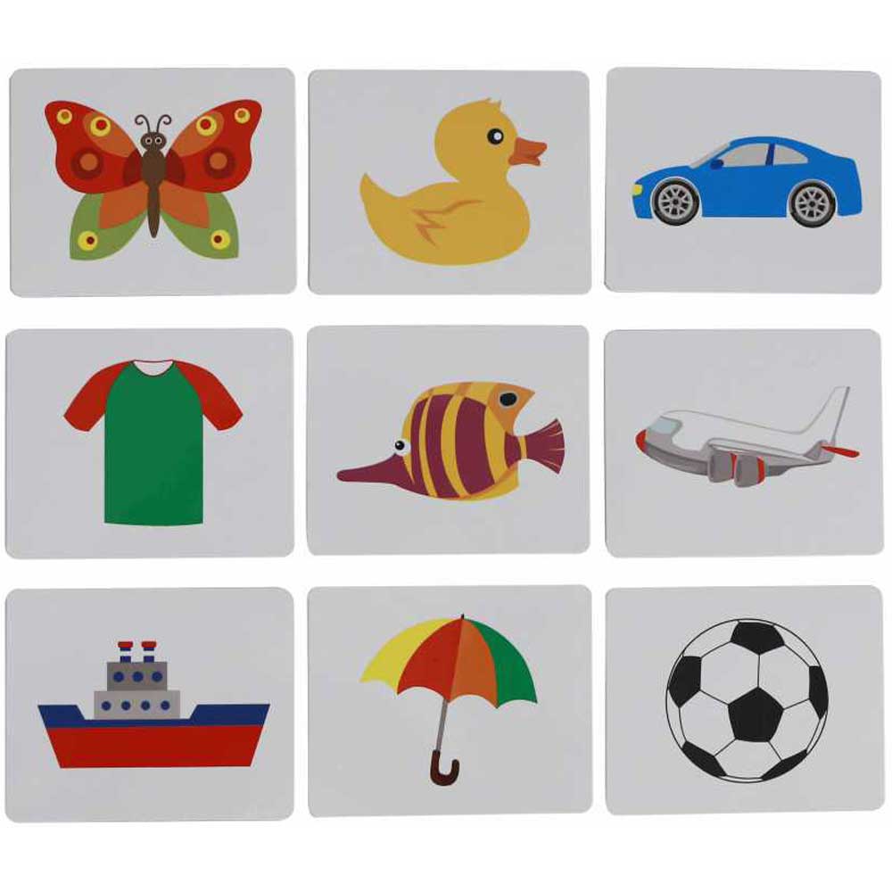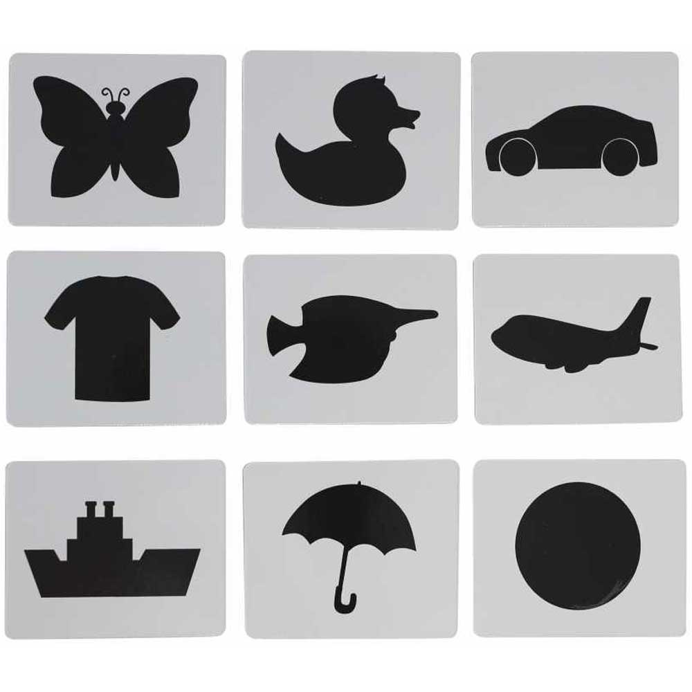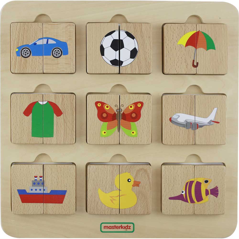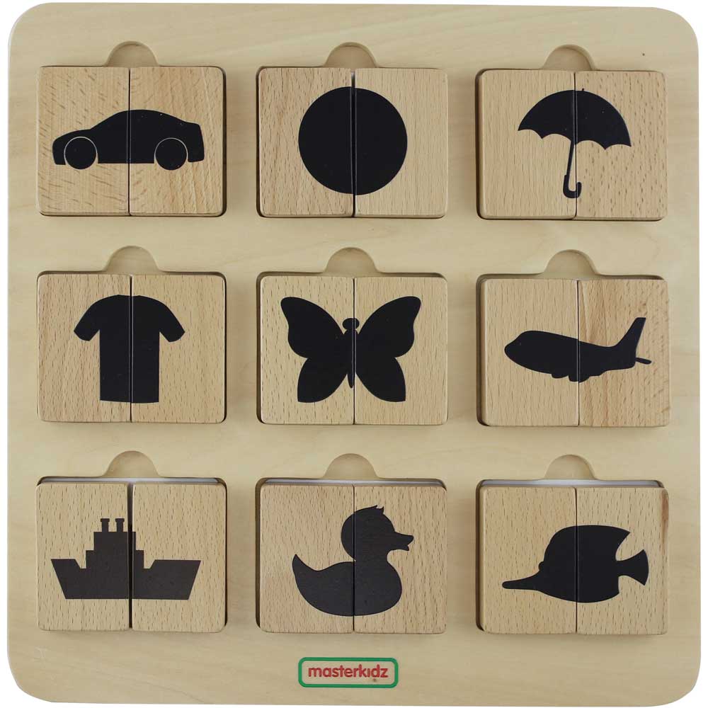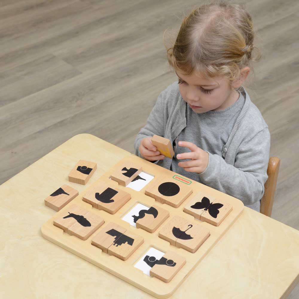 This toy includes 9 pairs of wooden tiles representing 9 objects both in colourful details and black shades. It also comes with 9 inserts printed with both representations of each object. To play, place the inserts randomly into the openings. Children will have to match the wooden tiles. To increase difficulty, we can ask children to match the coloured tiles by only showing them the black shades of the objects.