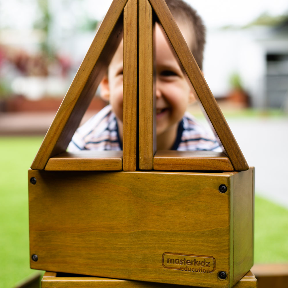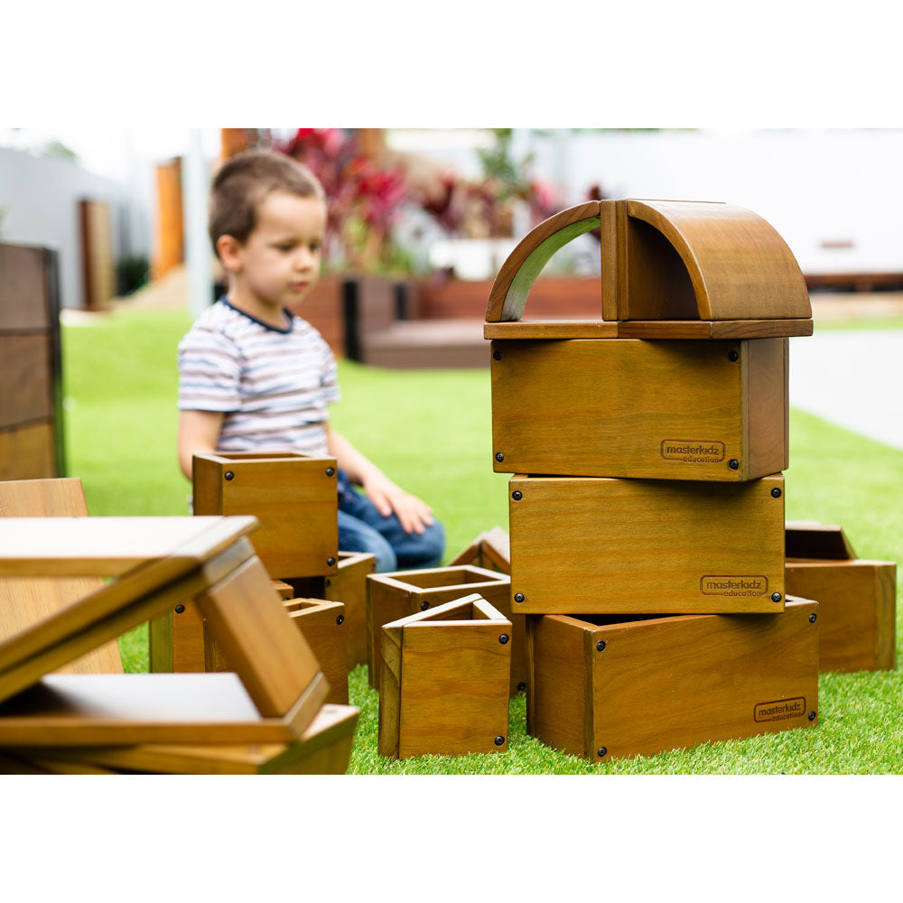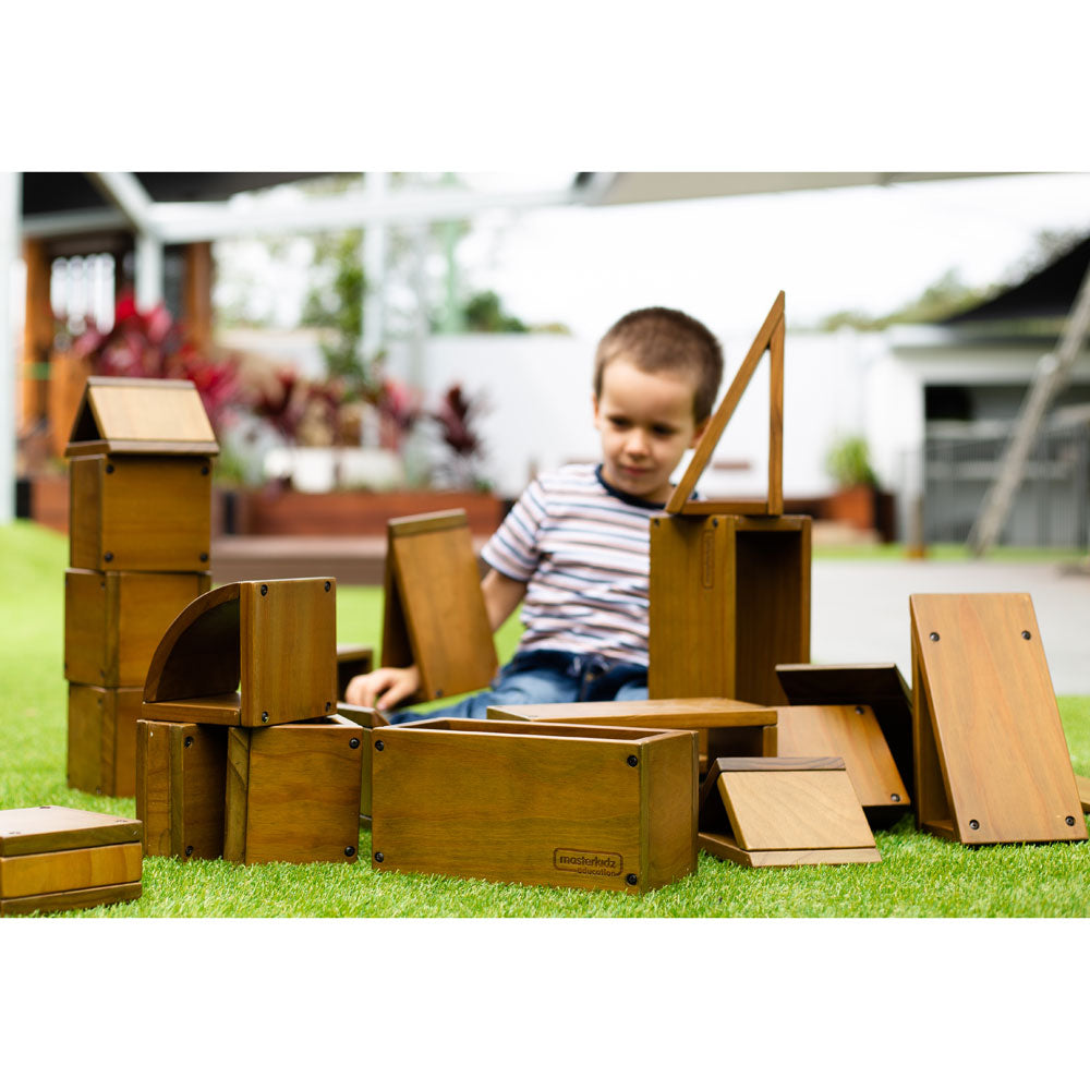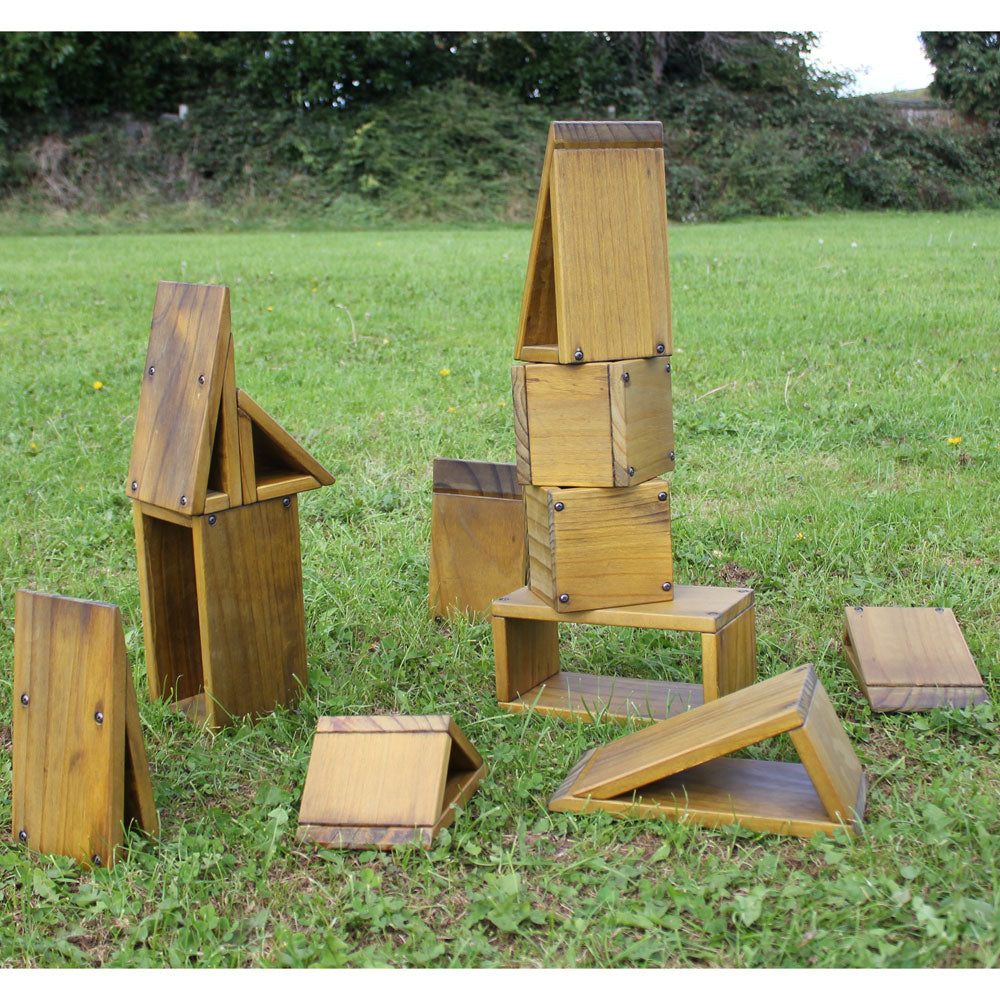 A set of 27 sturdy outdoor wooden blocks made from European pine pretreated with the eco-friendly and kid-safe NEXGEN outdoor wood treatment which is specifically engineered to protect the wood from fire, mould, mildew, and insects.
