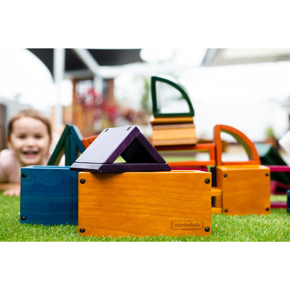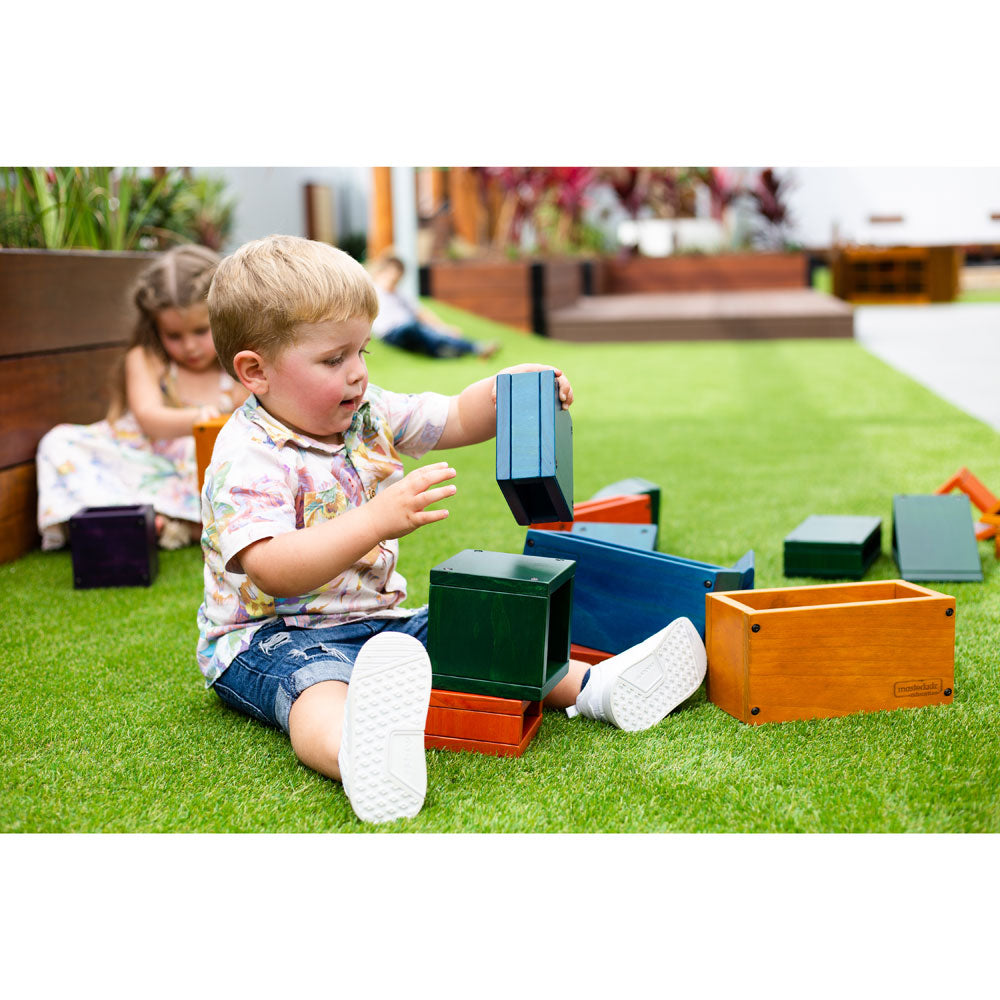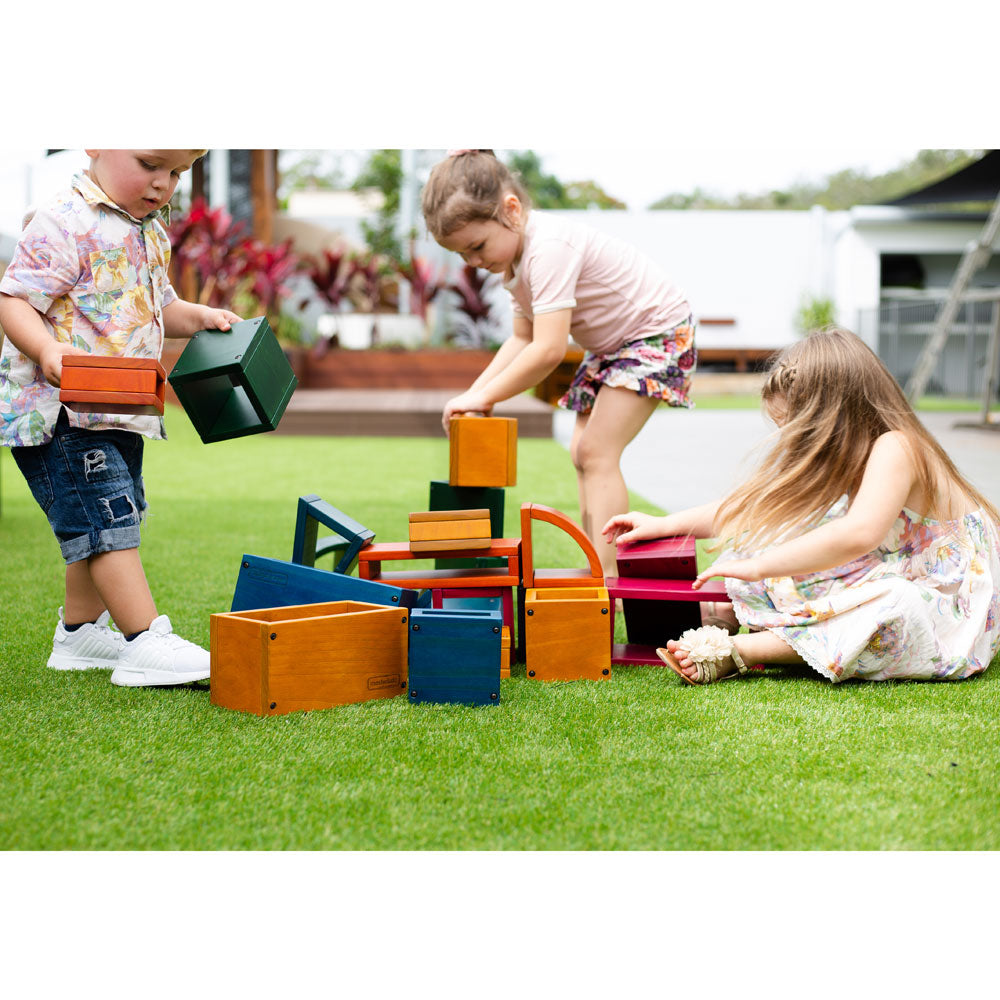 A set of 27 sturdy and colourful outdoor wooden blocks made from European pine pretreated with the eco-friendly and kid-safe NEXGEN outdoor wood treatment which is specifically engineered to protect the wood from fire, mould, mildew, and insects.