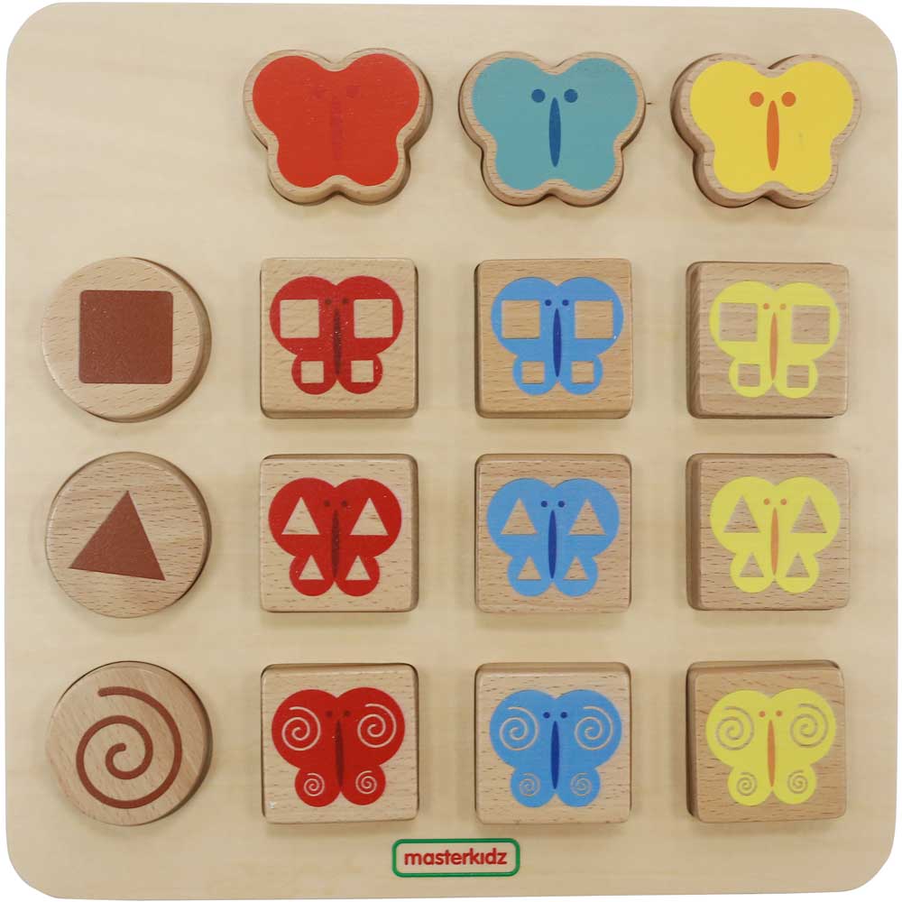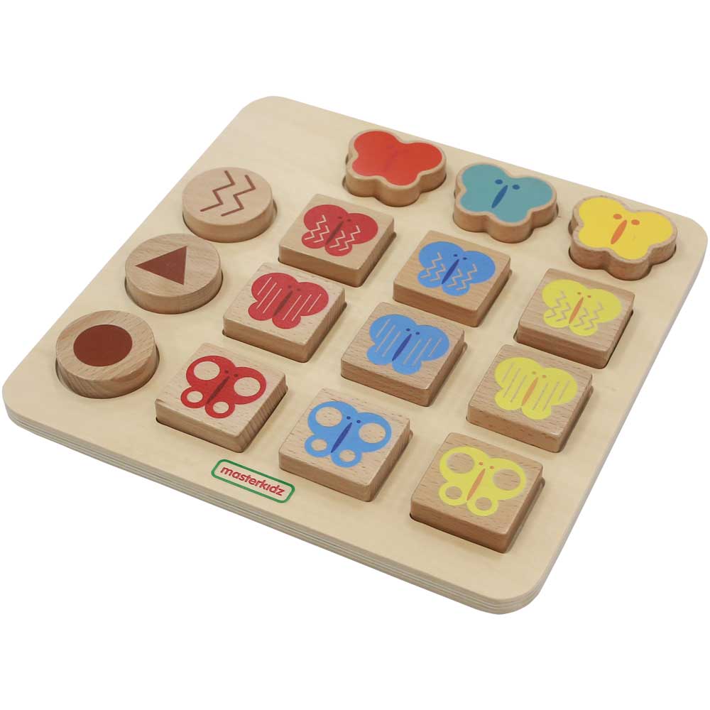 A great logical skills training toy combining 3 primary colours and 6 different patterns or shapes. To play, adults place the butterflies and circular tiles, children will have to place the tiles with matching colours and patterns.