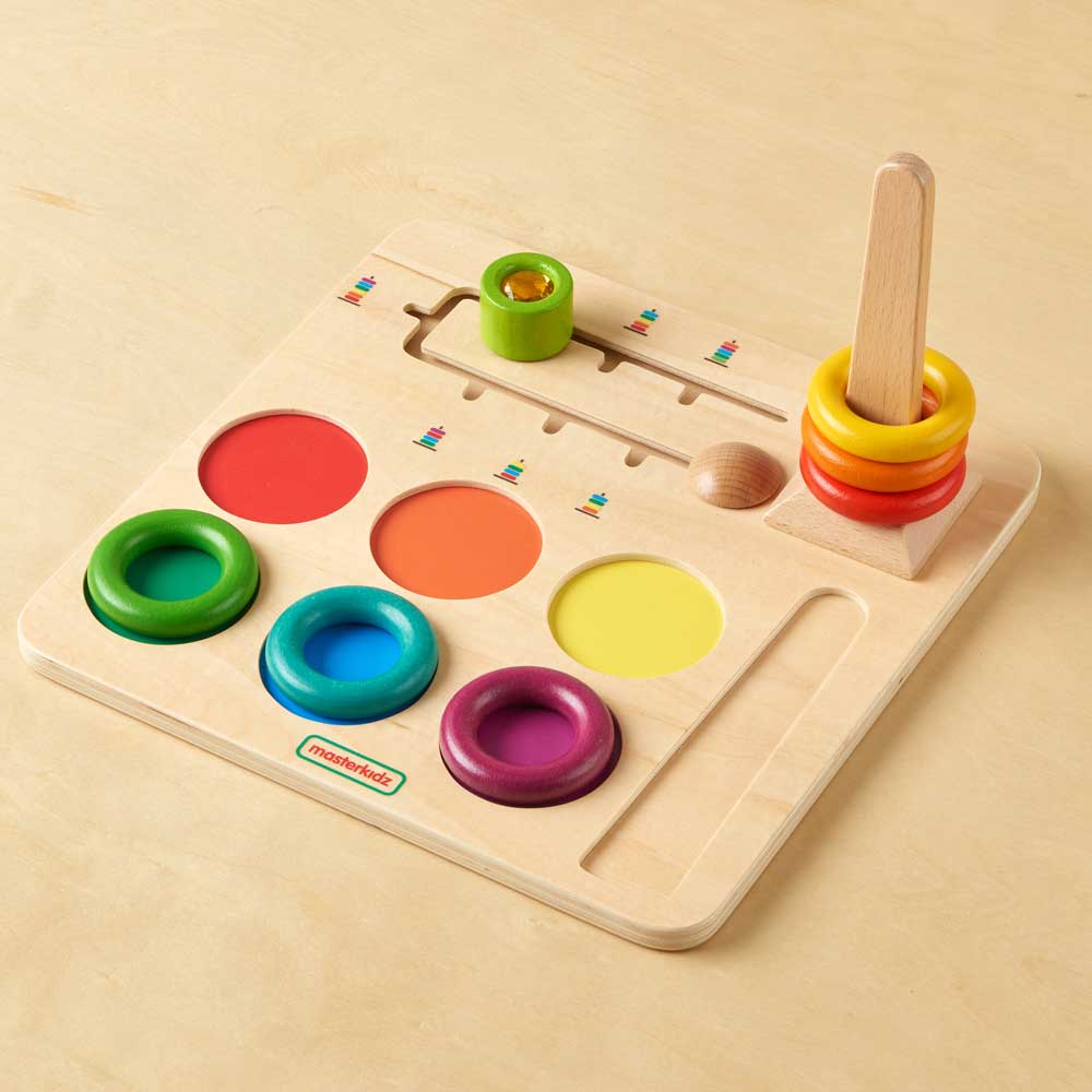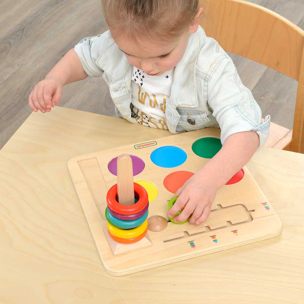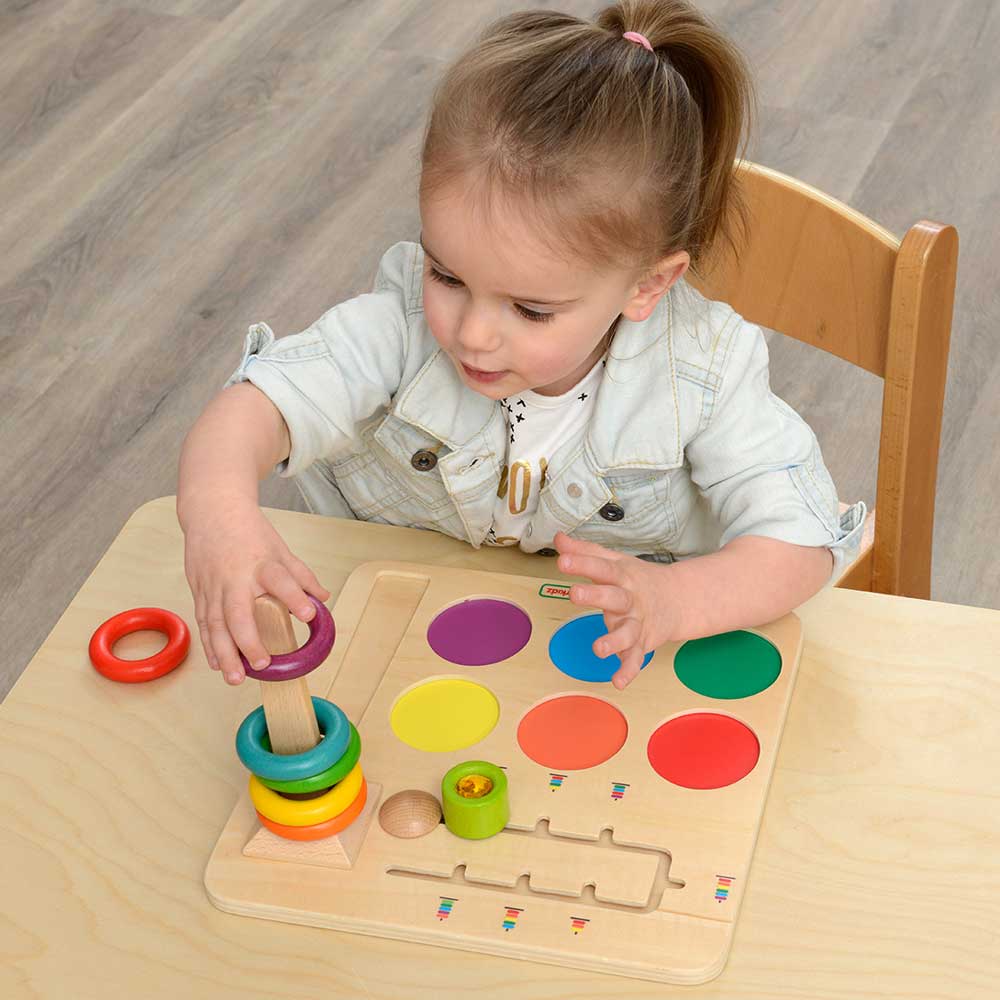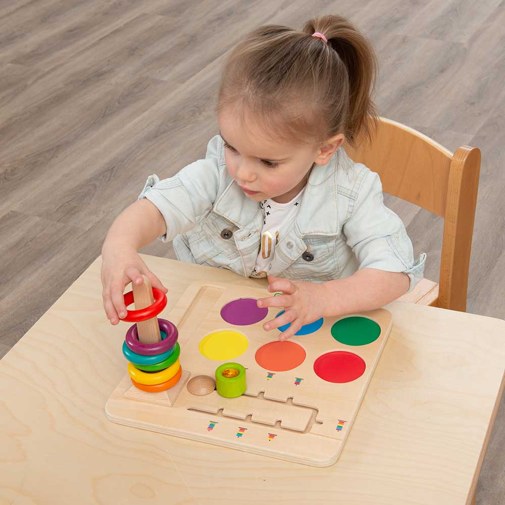 This product is great for colour recognition. logical thinking, spatial awareness and the development of fine motor skills. When placed on the table a child will see 6 colourful beech rings in red, orange, yellow, green, blue and maroon. There is a tapered peg that connects to a base plinth to create a vertical tower. The rings slot over this to form a stack. Children can use the board in open play to stack and arrange the rings in any order and to replace them back into their correct coloured holding place on the baseboard. In addition, for a more formal challenge, there is a slider button which presents a side view of coloured rings stacked in various sequences. Some of these challenges require all six rings, others less. Children will find they need to concentrate hard to recognise the colour sequences and to replicate them by selecting and placing the rings in the right combination on the tower. As a game, the stacking can be carried out by several children taking it in turns to pick and place the rings, with the other children watching to check they have selected correctly. Simple to play and great fun too!