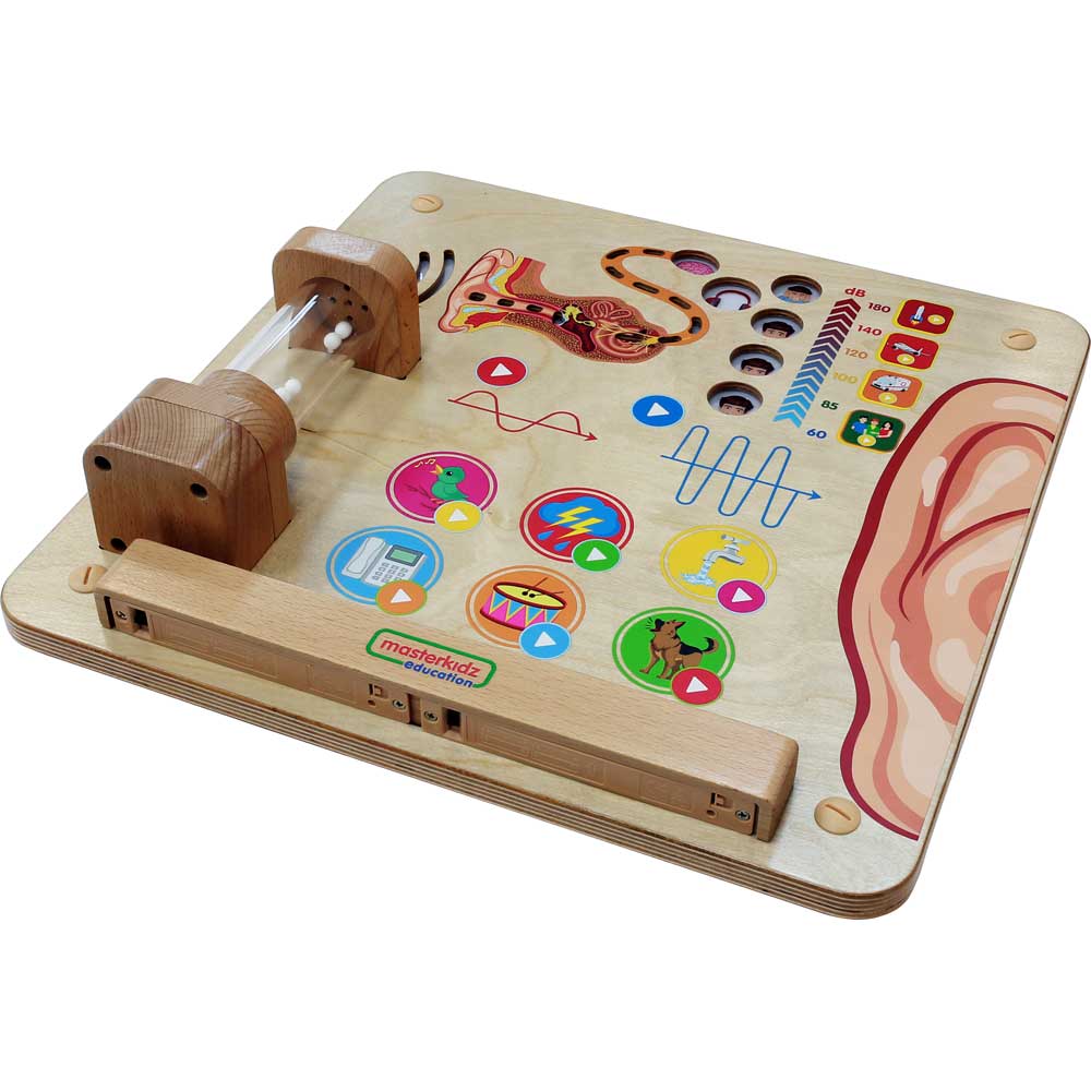 Hearing - The world would be a very different place without our ears! We want to tell children with our ears, we can listen to other people speaking, bird singing, dog barking and water running. When children touch any of the scenes on the panel, they can hear the corresponding sound. There are also high-pitched and low-pitched sound buttons. While looking at the sound waves diagrams, children can use their ears to find the difference between them. We also explain to children sound travels in waves through the air. Our ears gather up all of the sound waves around us and send the vibrations as signals to our brains. We have added a clear acrylic tube in order to show children sound travels through air. Everytime when a sound is being played, children should find there are different degrees of vibrations on the foam balls sitting at the middle of the tube. The foam balls vibrate when sound waves pass by. For example, when sound of a thunder storm is being played, children can see the foam balls vibrating. This is a good idea to let children "see" the transmission of sound waves. The wall panel also explains to children sound can be of different magnitude (loudness) and we need to protect our ears when the surroundings are too loud.