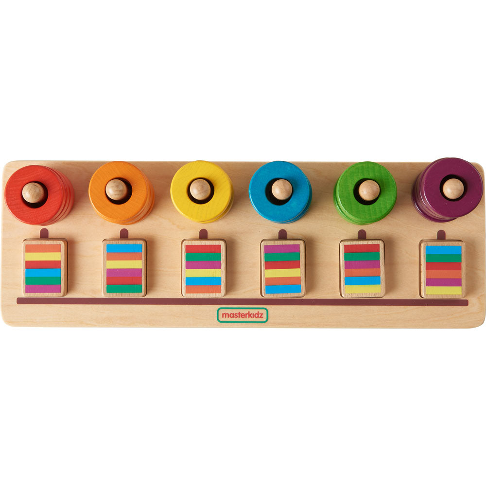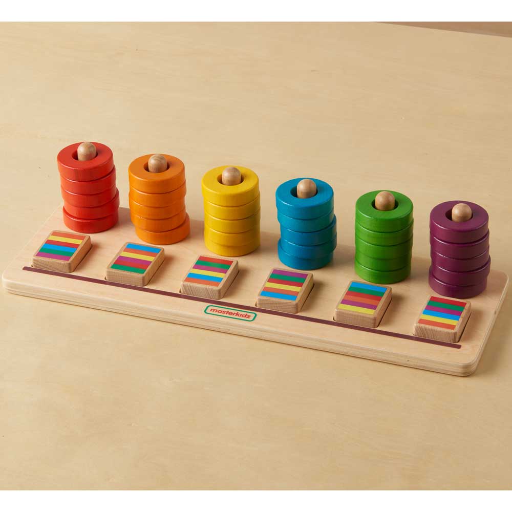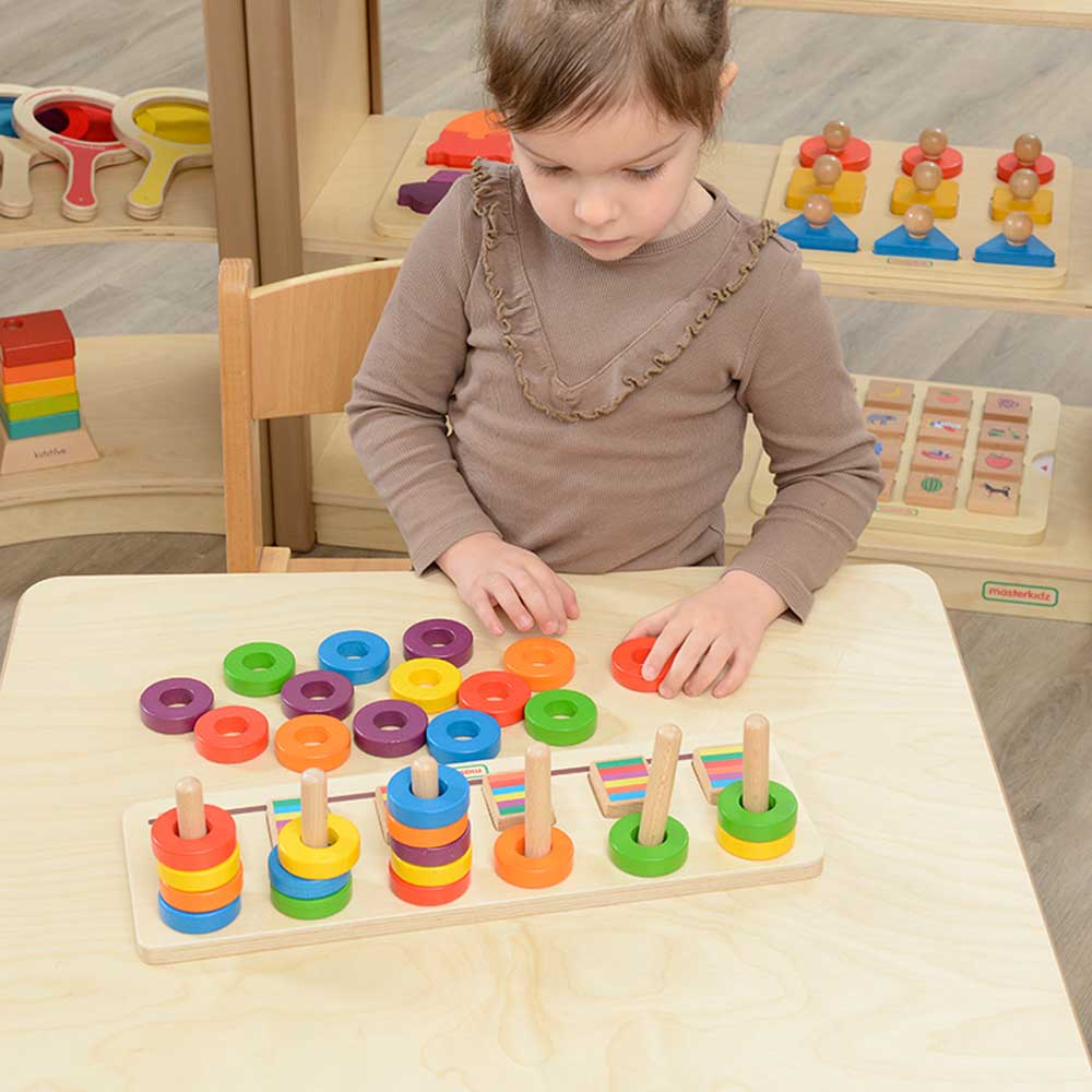 This desktop learning board is ideal as a sequencing puzzle for children from 2 years of age. There are 6 sets of rings each with their own distinctive colour. These can be used in open play or for colour identification, sorting, and sequencing on a desktop before being used with the base. The children can then progress to open stacking of similar colours and then sequences of different colours that they invent by themselves. The inset spaces in front of the stacking rods provide a space for prescribed sequence blocks, which challenge the children to find the correct coloured rings and repeat these in the same sequence from the top of the stack down. When they manage to complete a single stack of 6 in the correct order can they do the same for 2, 3, 4 and eventually 5 stacks. An interesting, absorbing, and wonderful resource that will develop better colour focus, spatial awareness, sequencing and logical thinking.