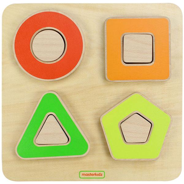 A simple shape matching toy featuring 4 basic shapes in different colors. Kids will first need to place the inner uncolored wooden blocks at the right opening before matching with the larger pieces. Wooden blocks are made of sustainable Beech Wood.