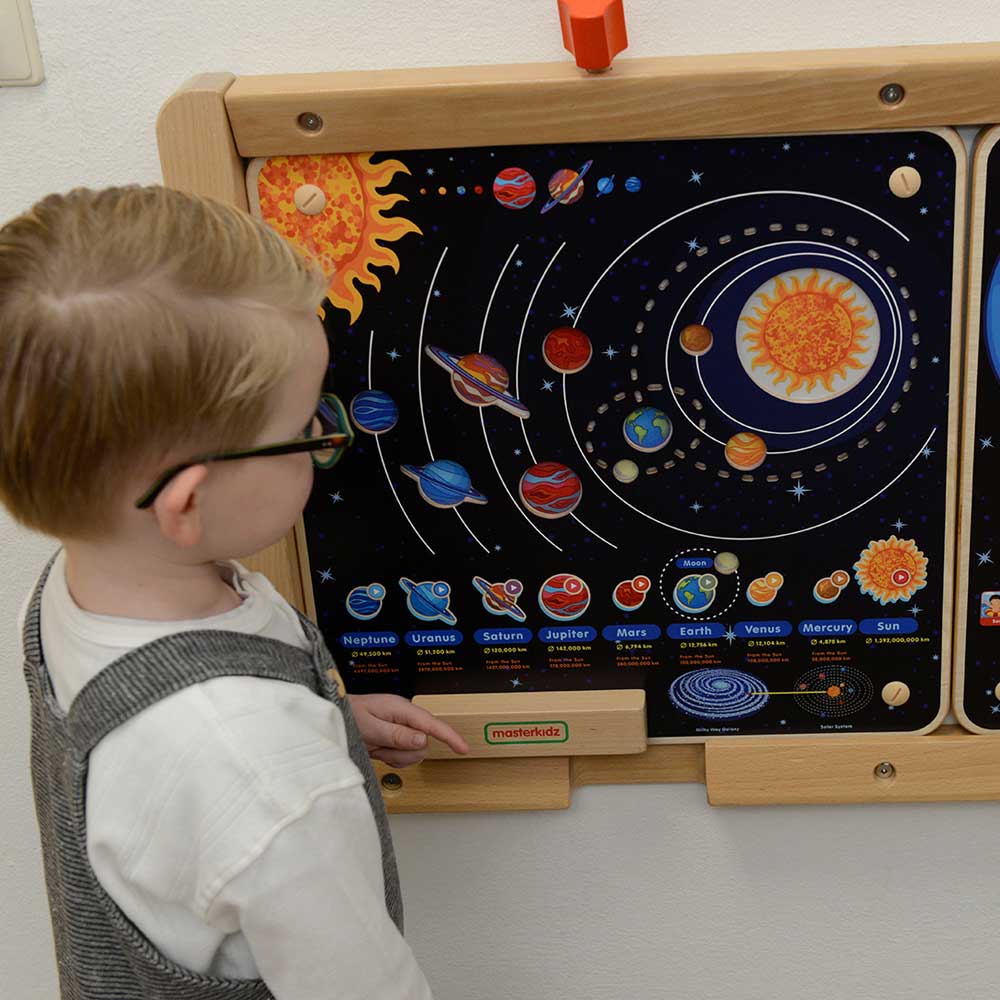 The Solar System Learning Board shows the Sun at the centre and the 8 planets (Mercury, Venus, Earth, Mars, Jupiter, Saturn, Uranus, and Neptune) including the Earth rotating around it. Mercury is closest to the Sun. Neptune is the farthest. Children will be able to see the correct order they appear in, their relative size and colouring, their distance from the sun and where the Earth fits into the picture. Along the bottom of the board each planet’s name and image appears and a touch button illuminates it in the bigger solar system schematic. When the Earth button is touched the Earth illuminates (showing it rotating around the sun at the same time as the moon is rotating around the Earth). A first solar system learning tool which will spark the interest of many budding astronomers.