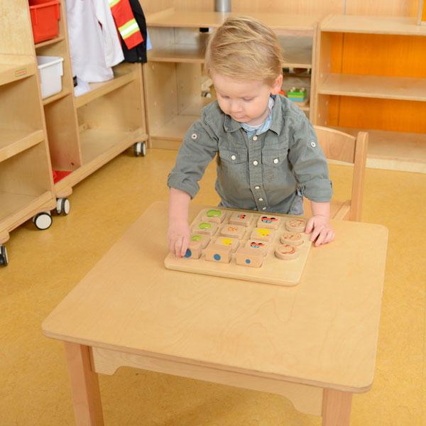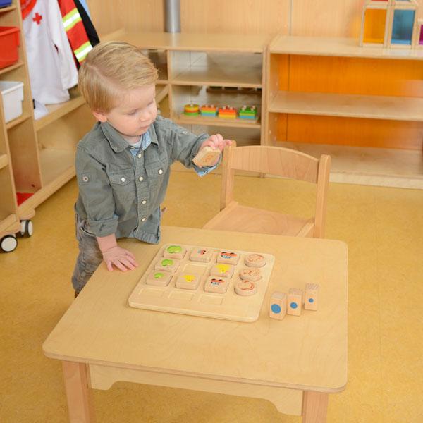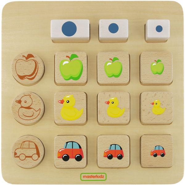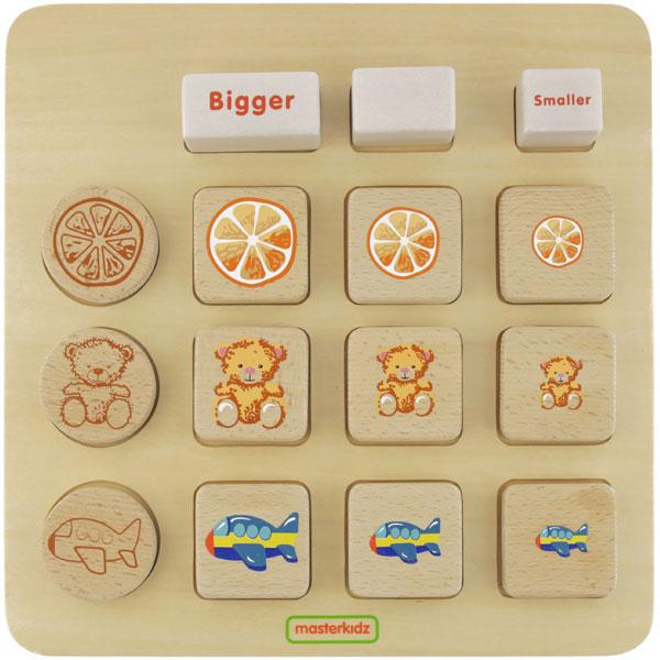 The 3 rectangular blocks on the top row represent various sizes from small to big. The 3 round blocks on the left column represent 6 different objects. To play, teacher or parent can use any one of the 3 round blocks and the 3 rectangular blocks, and ask the kid to match the square blocks with the size blocks. Or, to place all 3 rectangular blocks and all round blocks on the board, ask the kid to place all 9 square blocks at the right positions. A perfect toy for object learning, size comparison, size sequencing and logical thinking skills development.