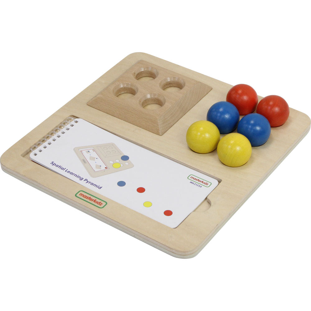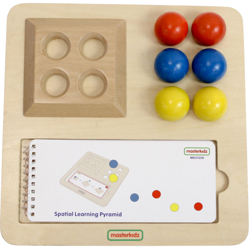 This educational resource features a Spatial Learning Pyramid, composed of three distinct colours and six weighted balls to stack atop a pyramid-shaped base. Included with this item is a comprehensive resource guide to explore the spatial learning through colours and sequence.