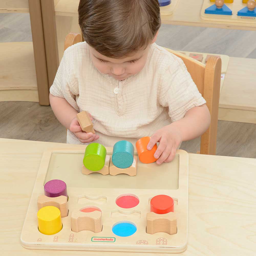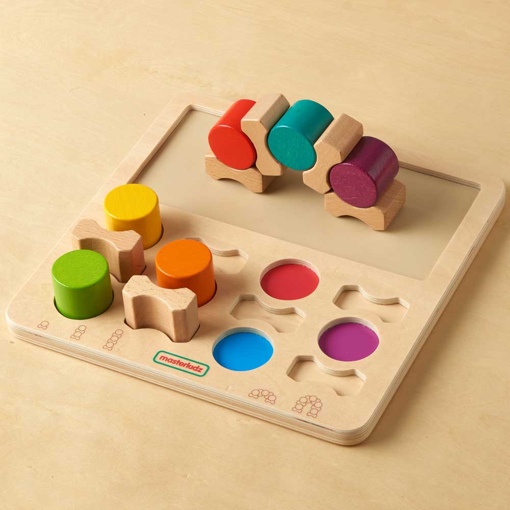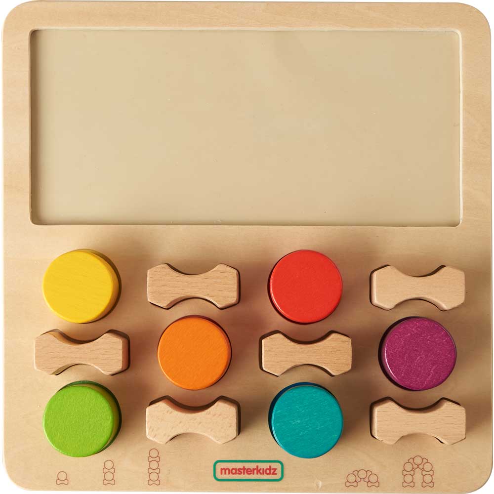 This product is great for colour recognition. logical thinking, spatial awareness and the development of fine motor skills. When placed on the table a child will see 6 colourful beech rings in red, orange, yellow, green, blue and maroon. There is a tapered peg that connects to a base plinth to create a vertical tower. The rings slot over this to form a stack. Children can use the board in open play to stack and arrange the rings in any order and to replace them back into their correct coloured holding place on the baseboard. In addition, for a more formal challenge, there is a slider button which presents a side view of coloured rings stacked in various sequences. Some of these challenges require all six rings, others less. Children will find they need to concentrate hard to recognise the colour sequences and to replicate them by selecting and placing the rings in the right combination on the tower. As a game, the stacking can be carried out by several children taking it in turns to pick and place the rings, with the other children watching to check they have selected correctly. Simple to play and great fun too!