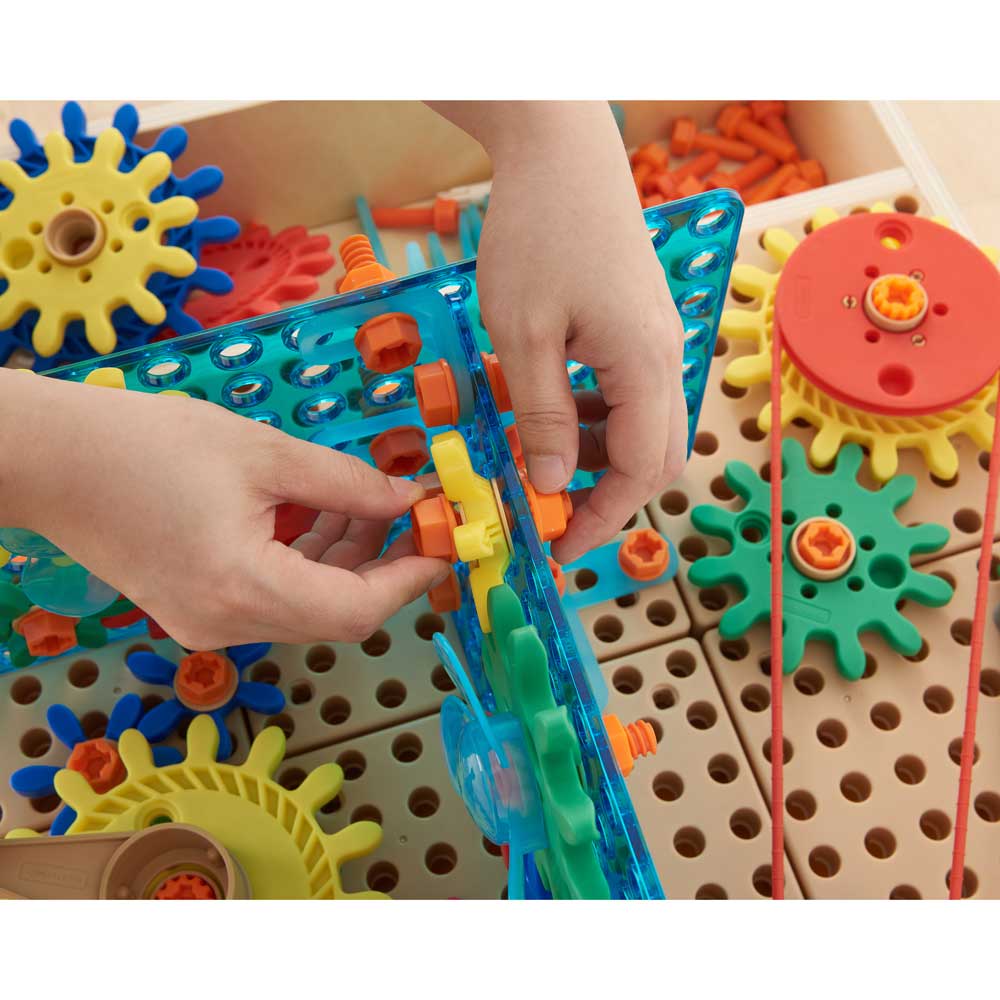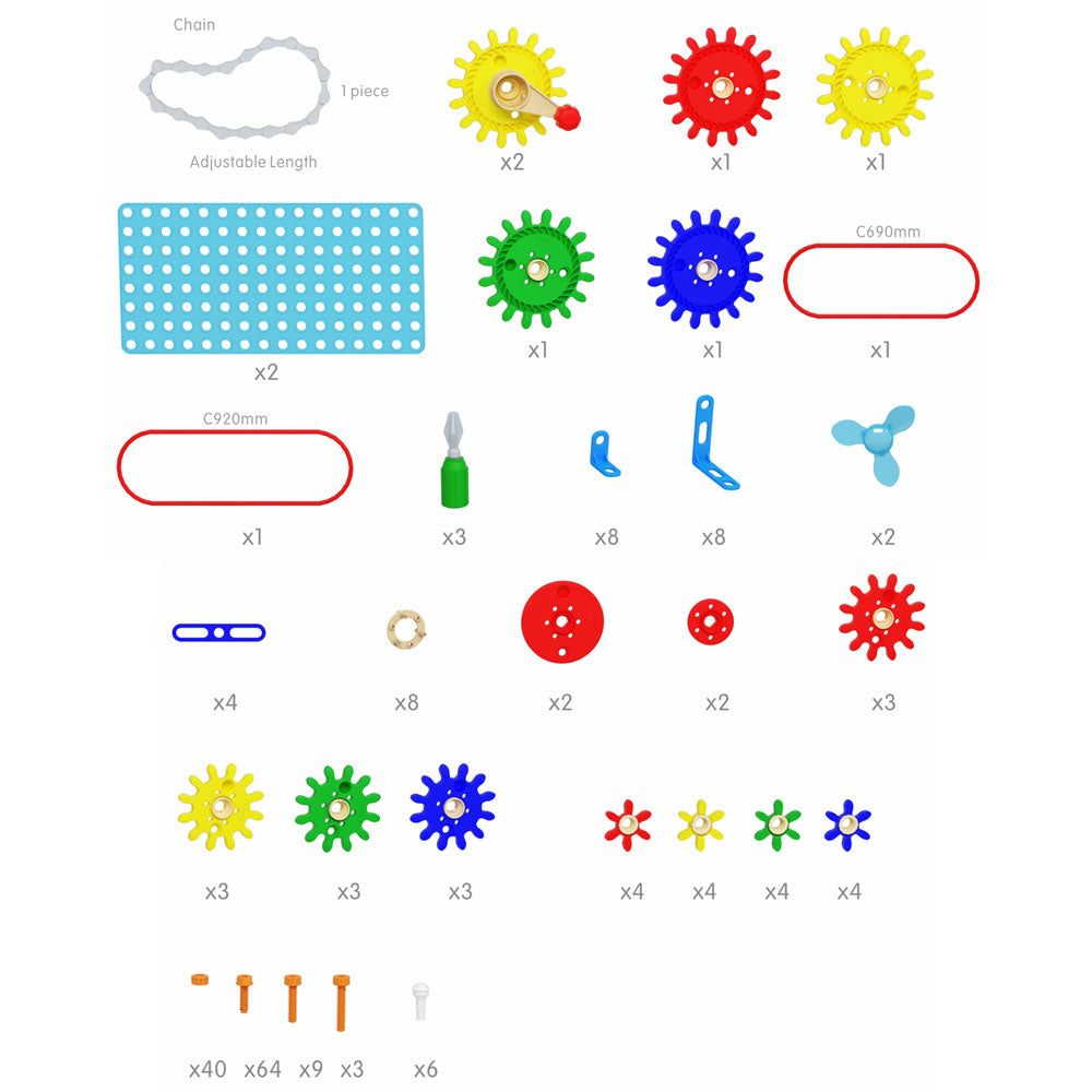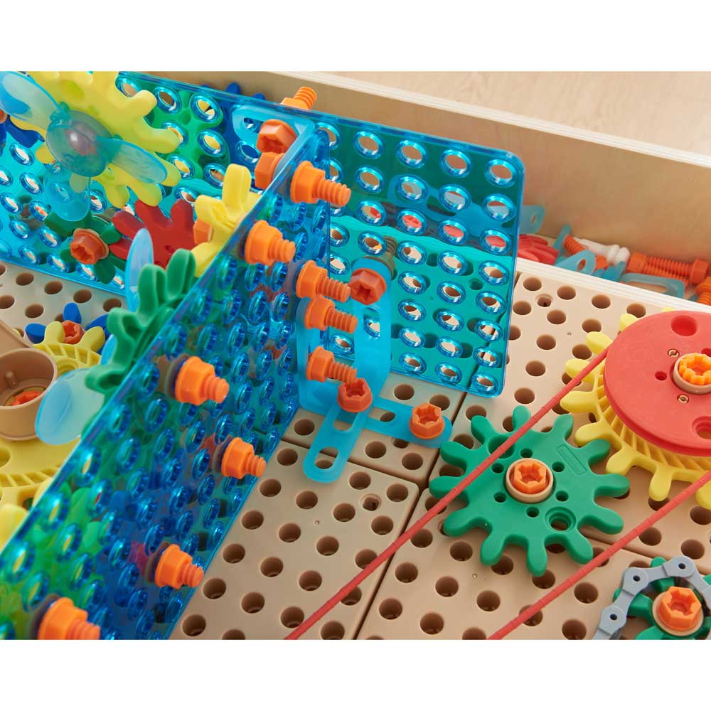 This 198 piece set provides a huge selection of components to encourage children to build and make their own mechanical devices. They can simply fix components to any STEM Wall, trolley or table in open discovery play adding pieces to see what happens. There are 34 gears in different sizes and some with a wind handle so they can be the driver of other interconnected gears. There is a drive chain, 2 pulley belts, 4 pulleys (in two sizes) and a cage connector to enable pulleys to be connected together, gears to be connected together or gears and pulleys fixed to each other. In addition, there are 2 panels (200mm x 400mm) with brackets to connect them to a STEM Wall providing another surface which can be set at 90 degrees to create mechanical systems in 3 dimensions! There are easily enough components in this set for an entire class or to extend the possibilities of a whole school resource towards even greater STEM possibilities.