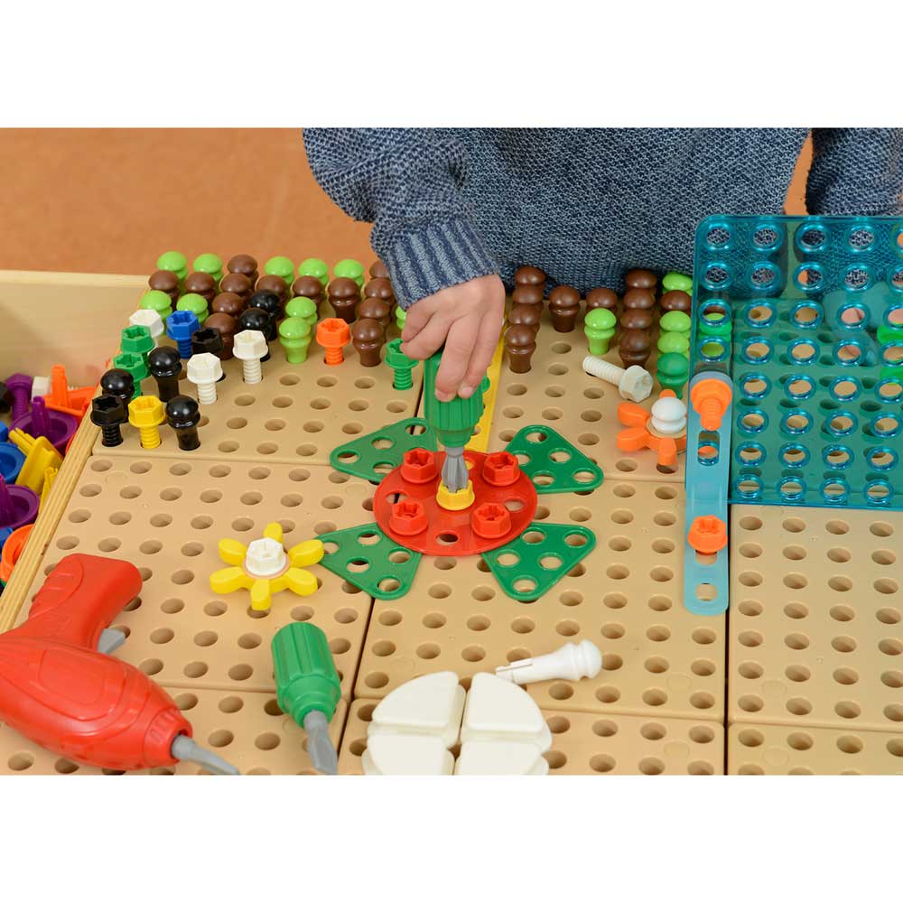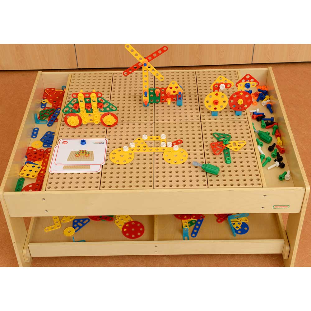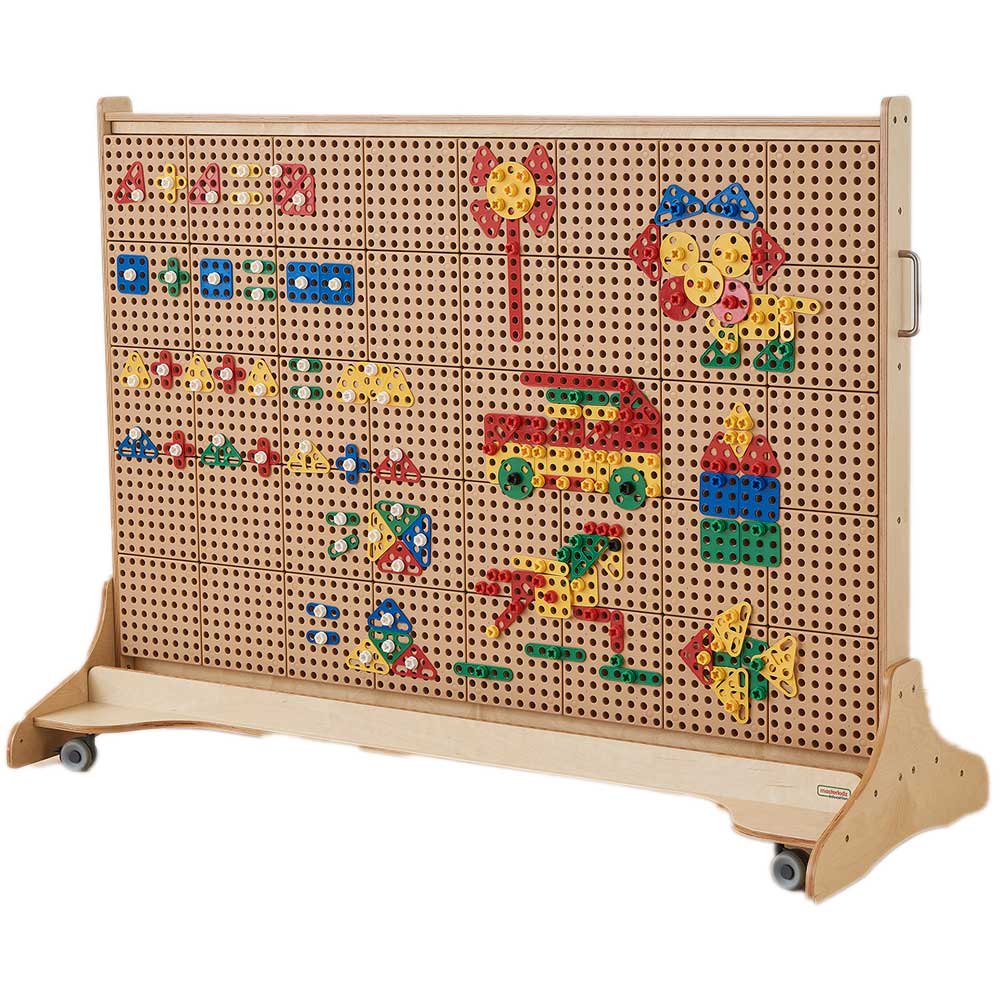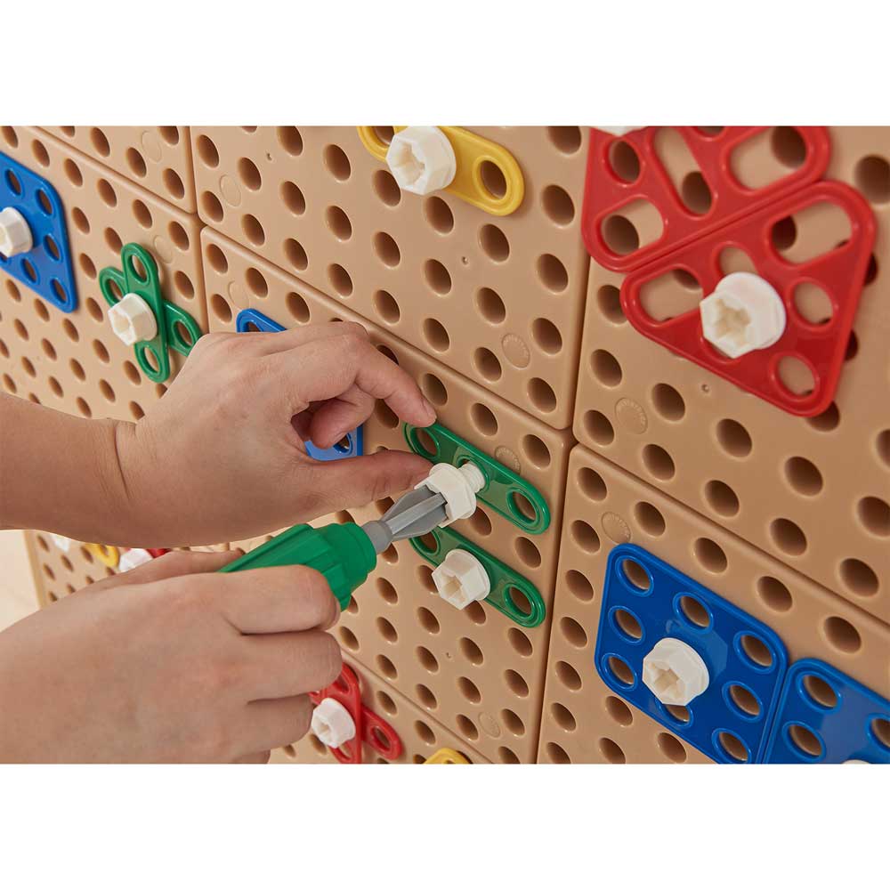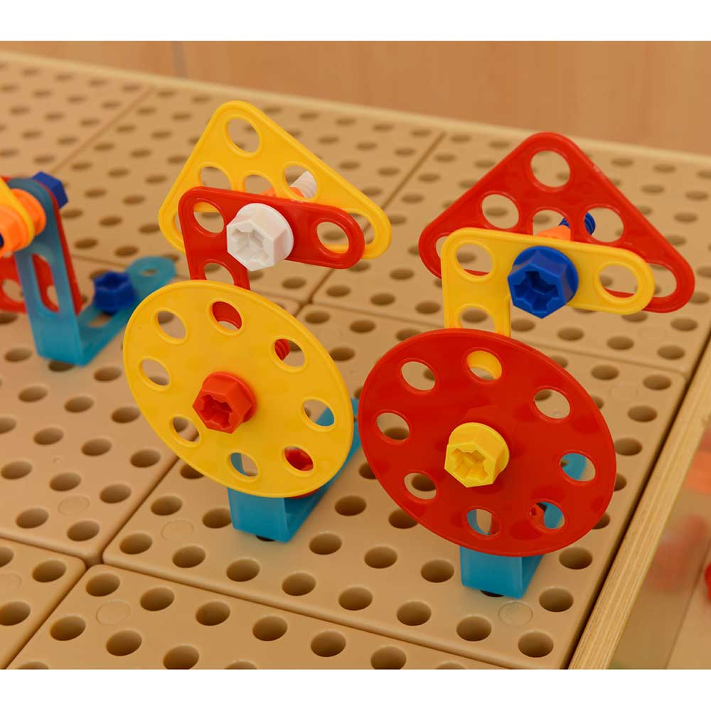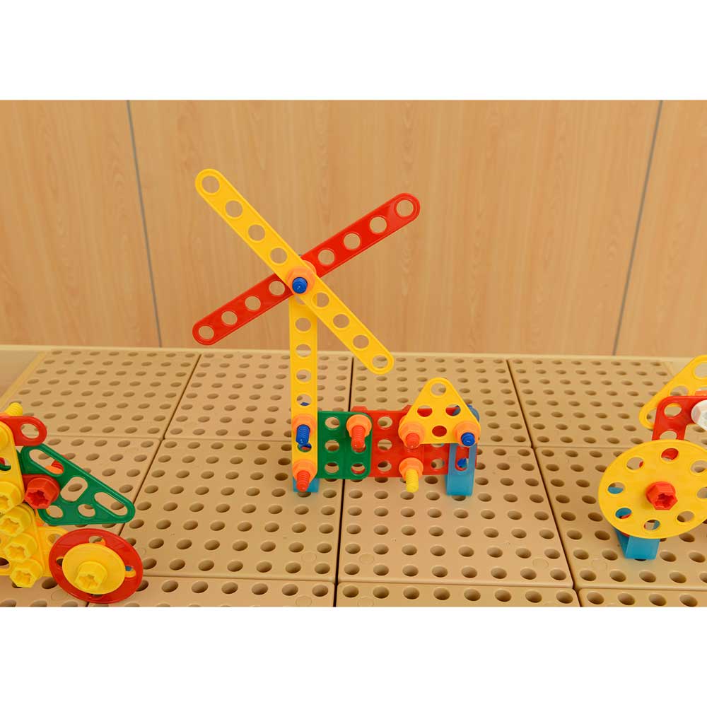 This set has 260 components so there are easily enough components to keep a whole class of children busy! There are 4 flat shapes – square, triangle, circle and semi-circle in 4 different colours (red, green, yellow and blue) and in different sizes. They are all populated with holes so they can be fixed using bolts to any Masterkidz STEM surface. In addition, there are flat strip pieces in straight and right-angle shapes too. Given the freedom to build creatively, children will be busy fixing the shapes to a STEM Wall, table or trolley either alone or in small groups working collaboratively together. There is so much STEM learning taking place when children are building in this way – planning, selecting, creating, adding to and refining their designs. Every piece needs to be screwed in and there are choices to be made about colours, where to add screws – the orientation of the shapes and so on. There is the mathematical language of the pieces too. Care is required to make a picture look correct. For example, can a child make a realistic looking flower with a stem, leaves and petals arranged symmetrically? The potential for constructive design work is endless and this set will encourage so much learning with the fun of creating a unique design every time.