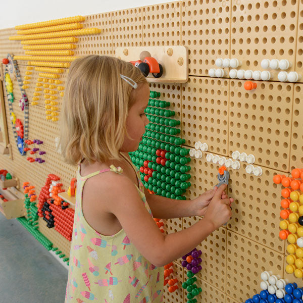 The 6-piece hand tool set will give little builders hours of fun screwing and unscrewing the Masterkidz Wall Screws on the STEM Wall. Either of the four different tool bits fit the Wall Screws. All tool bits can be interchanged with the handle or the power drill (ME13118) sold separately. The set includes a spanner so two children can work independently.