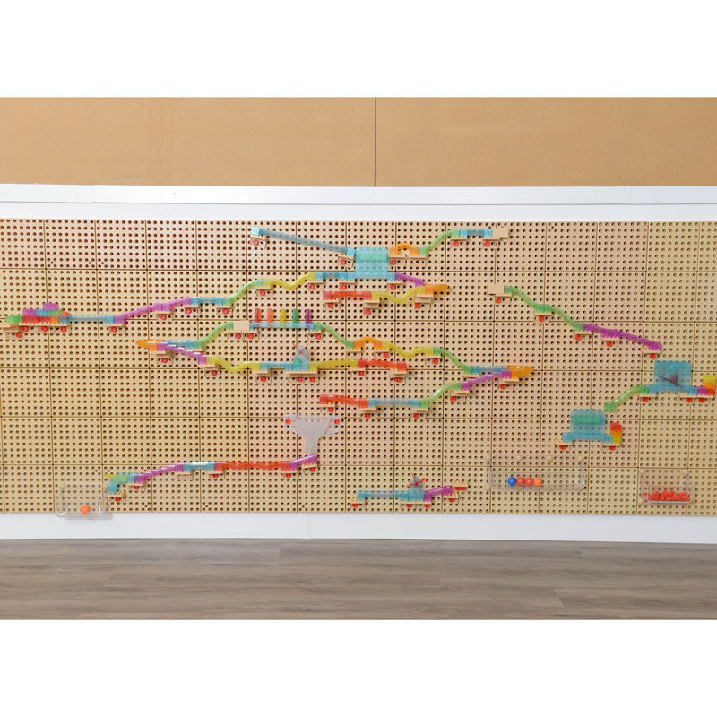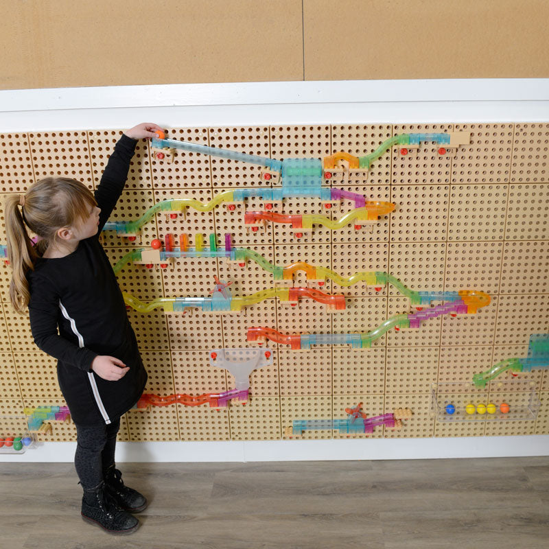 Children love creating their own special ball tracks. The Masterkidz Kinetic Ball TraX system is the ultimate ball track with which children can construct paths and tracks by adding dominoes, direction changers and other motion gears. It is the ultimate STEM toy for children to learn and enjoy. The Kinetic Ball TraX system can be played with on all Masterkidz STEM Walls and on a table or floor using the STEM Building Brick Baseplate. Children can build ball tracks on the STEM Wall extending to a table or the floor.