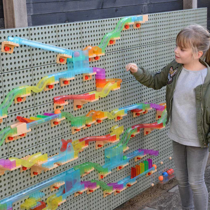 Children love creating their own special ball tracks. The Masterkidz Kinetic Ball TraX system is the ultimate ball track with which children can construct paths and tracks by adding dominoes, direction changers and other motion gears. It is the ultimate STEM toy for children to learn and enjoy. The Kinetic Ball TraX system can be played with on all Masterkidz STEM Walls and on a table or floor using the STEM Building Brick Baseplate. Children can build ball tracks on the STEM Wall extending to a table or the floor.