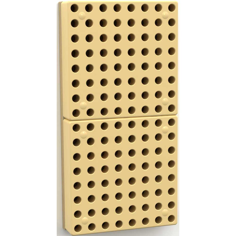 A wall mounted Pegs ‘N Bolts STEM Wall panel. Each hole is compatible with our durable Pegs and Bolts. Add Gear Wheels and Chain or our Water Pump and Pipe Kit for limitless designs. Flexible combinations allow infinite panel extensions compatible all with STEM Wall panels.