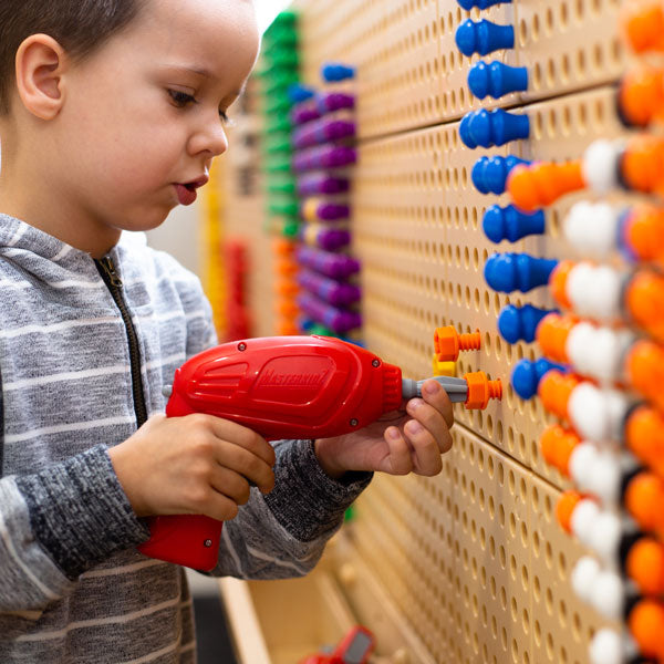 A wall mounted Pegs ‘N Bolts STEM Wall panel. Each hole is compatible with our durable Pegs and Bolts. Add Gear Wheels and Chain or our Water Pump and Pipe Kit for limitless designs. Flexible combinations allow infinite panel extensions compatible with 120 and 80cm wall panels.